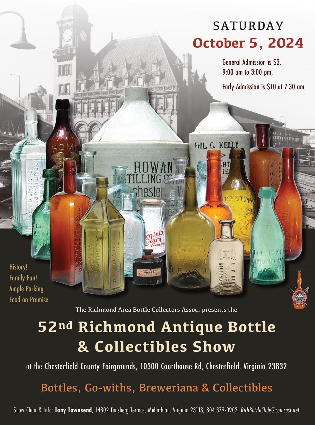 The Richmond Area Bottle Collectors Assoc. presents the 52nd Richmond Antique Bottle and Collectibles Show and Sale; General Admission is $3, 9:00 am to 3:00 pm; Early Admission is $10 from 7:30 am, at the Chesterfield County Fairgrounds, 10300 Courthouse Road, Chesterfield, Virginia 23832. Info: Tony Townsend, 804.379-0902; RichBottleClub@comcast.net, FOHBC Member Club