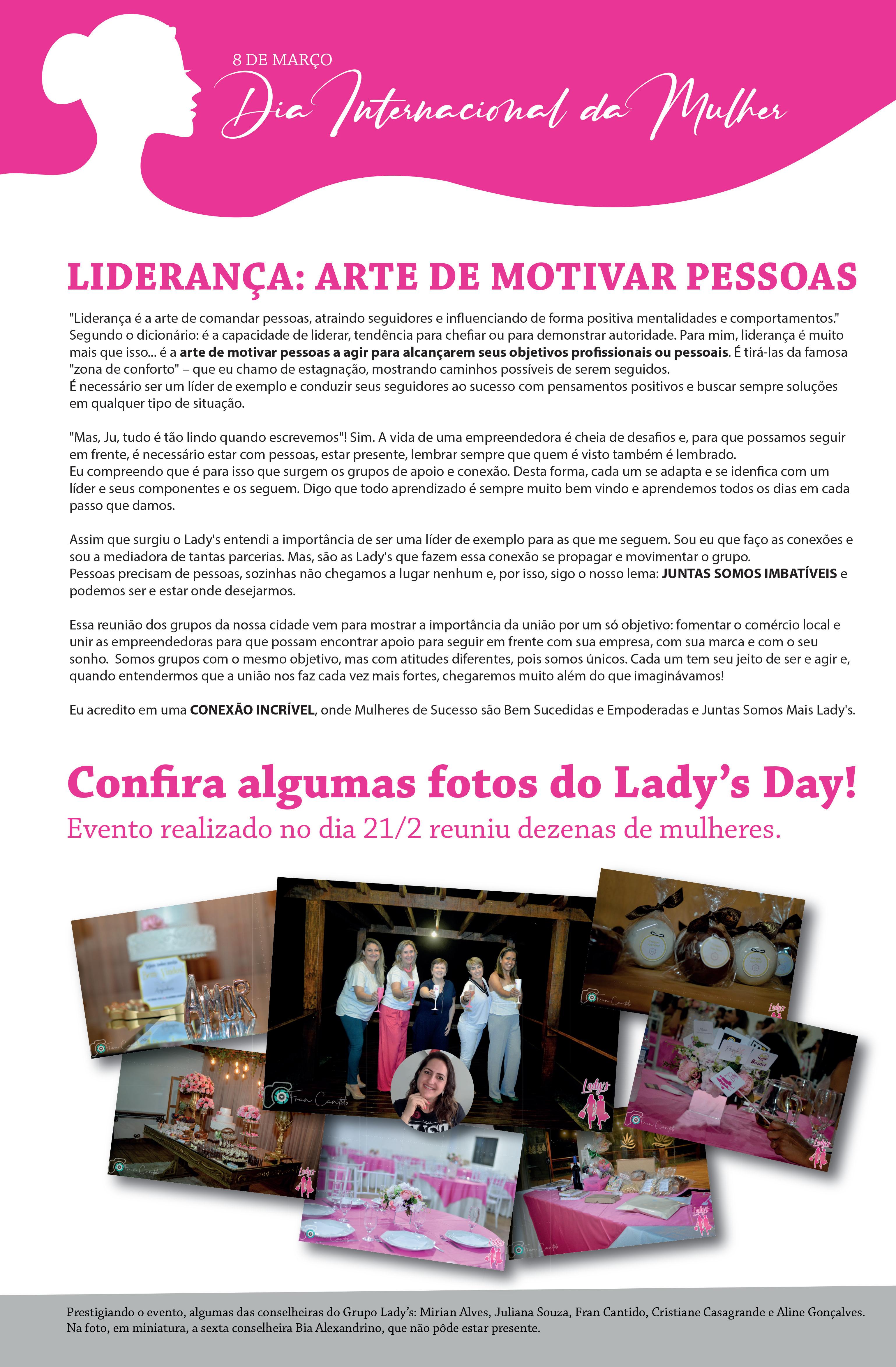 O Grupo Lady's iniciou em 2018 e partiu da necessidade de networking entre mulheres empreendedoras, aquelas que possuem inúmeras tarefas além do seu negócio. “Costumamos nos encontrar para reuniões, bate-papos, eventos, encontros e pitch de ven-