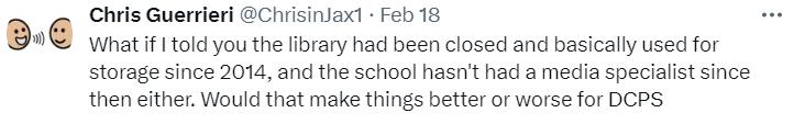 “That picture is TRUE. I’ve posted this before—after my oldest 2 kids left Elem school, they never went to a school library to check out a book again. Sandalwood’s library has had no books for more than 5 yrs; Mandarin HS emptied their library in 2019.”