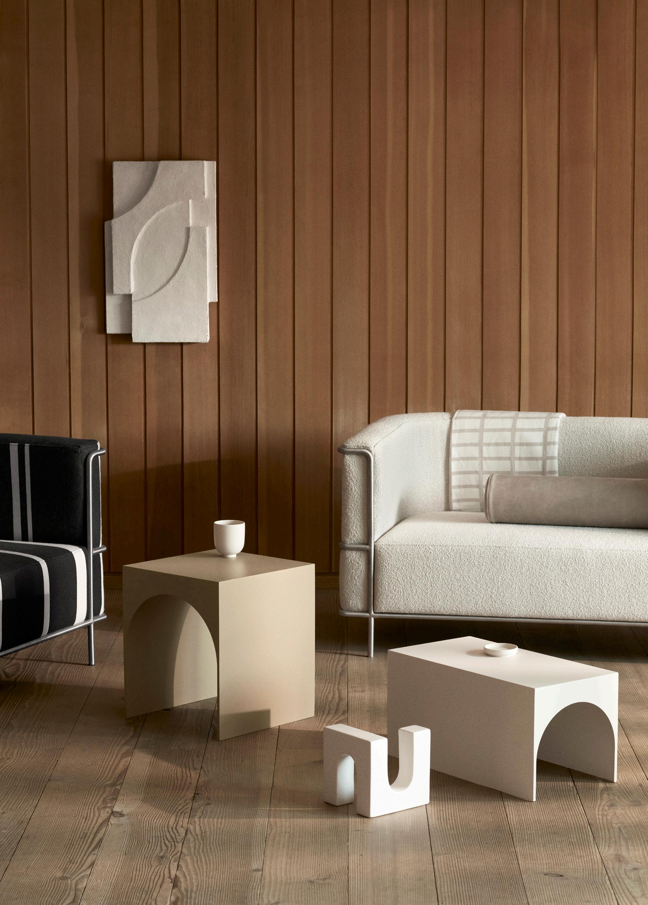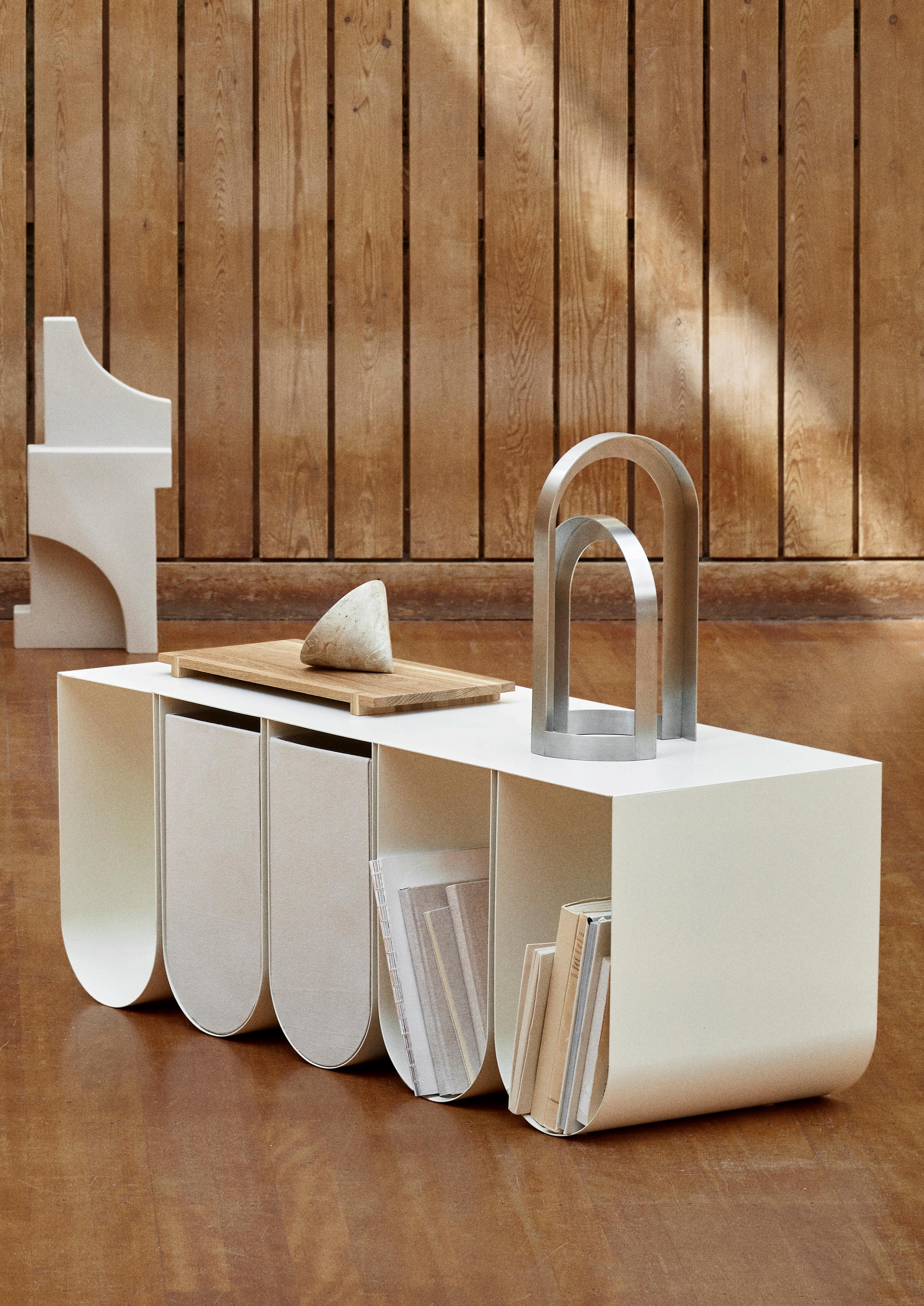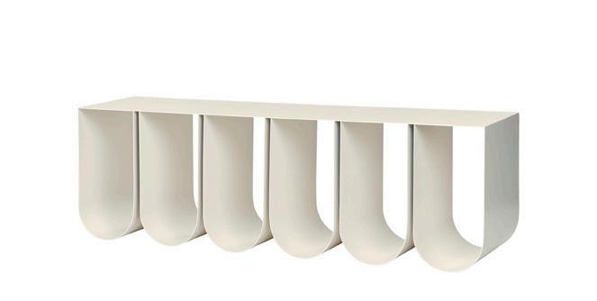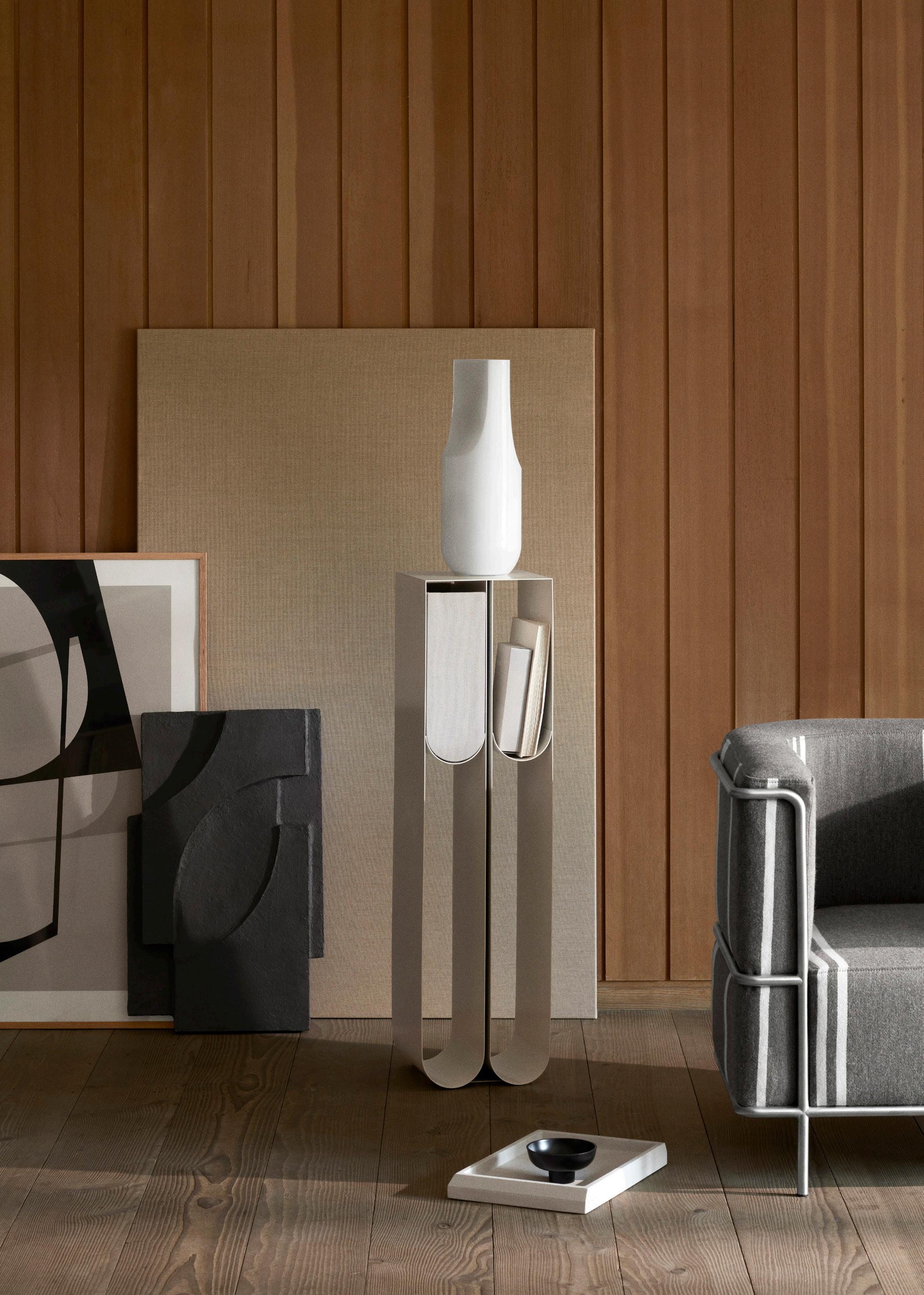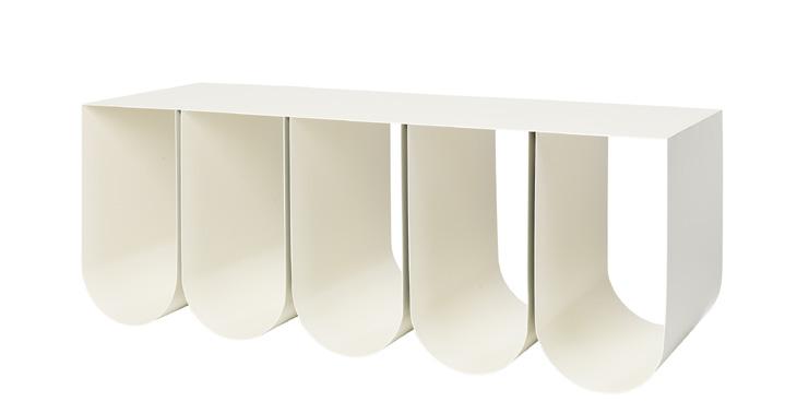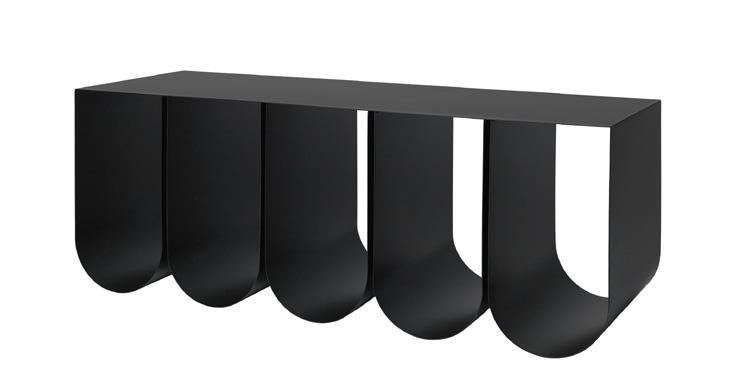 The Curved series are sculptural timeless signature designs, paying tribute to simplicity and crafted from powder coated or stainless steel. The sleek lines in the designs complement many spaces, functioning as side tables, a bench or shelving, allowing for displaying admired sculptures or storing everyday necessities in the tactile storing boxes.