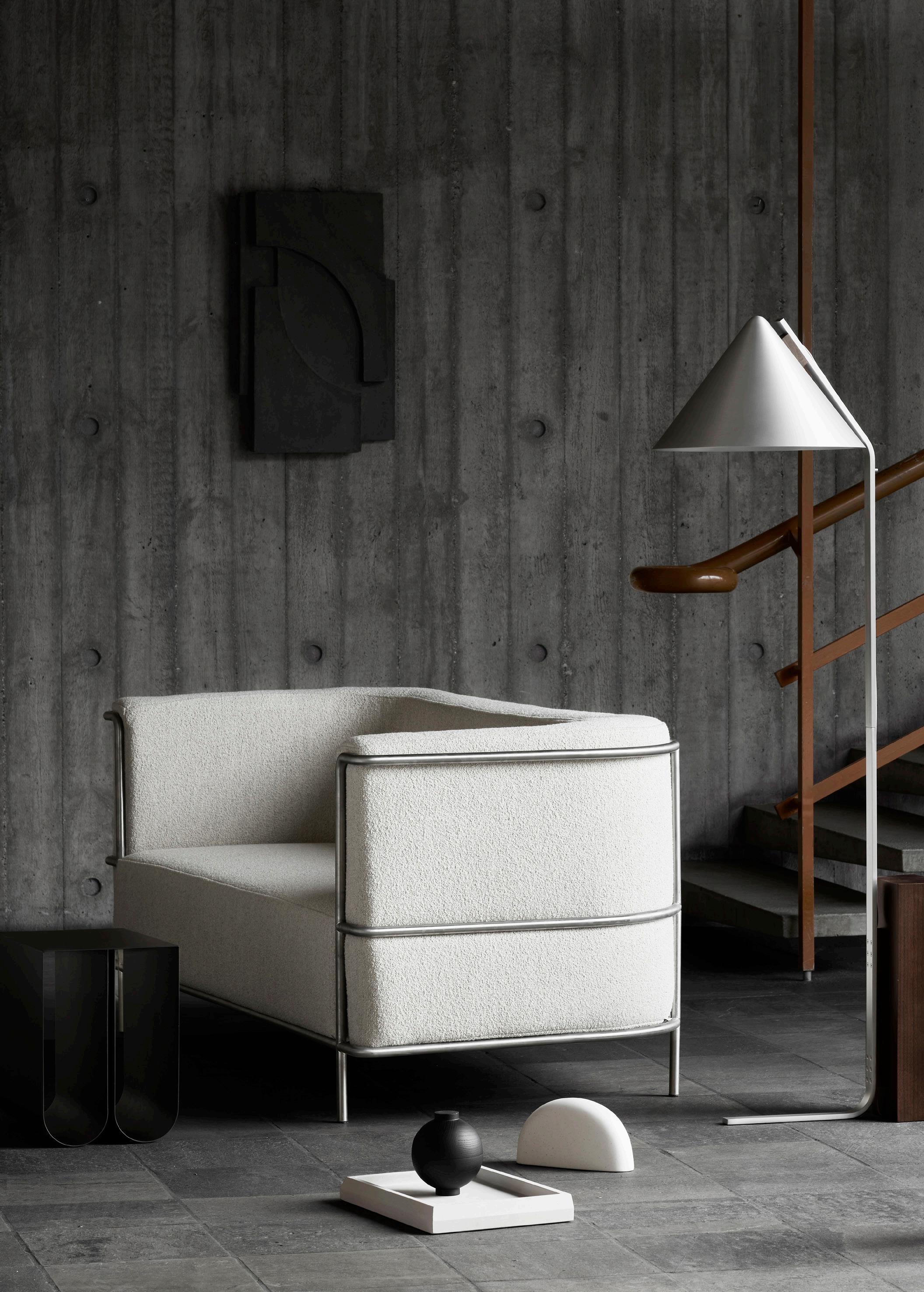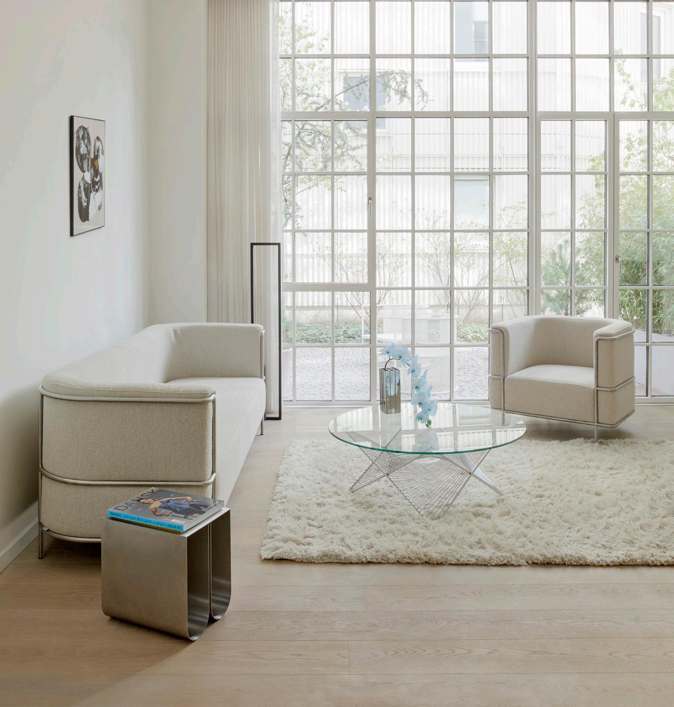The Modernist series is a classic yet contemporary series that adds a refined elegance to living rooms and open office spaces. The sofa is sharply framed in stainless steel and then tender softness with generously proportioned upholstery. Our Modernist series is delivered in seven different upholsteries, from light beige bouclé and deep grey wool to the classic Danish Savak fabric. All durable materials are woven from selected fibres like New Zealand wool and alpaca. The tactility of each fabric epitomizes Scandinavian aesthetics in their truest form and makes each a creative expression of the slender steel frame.