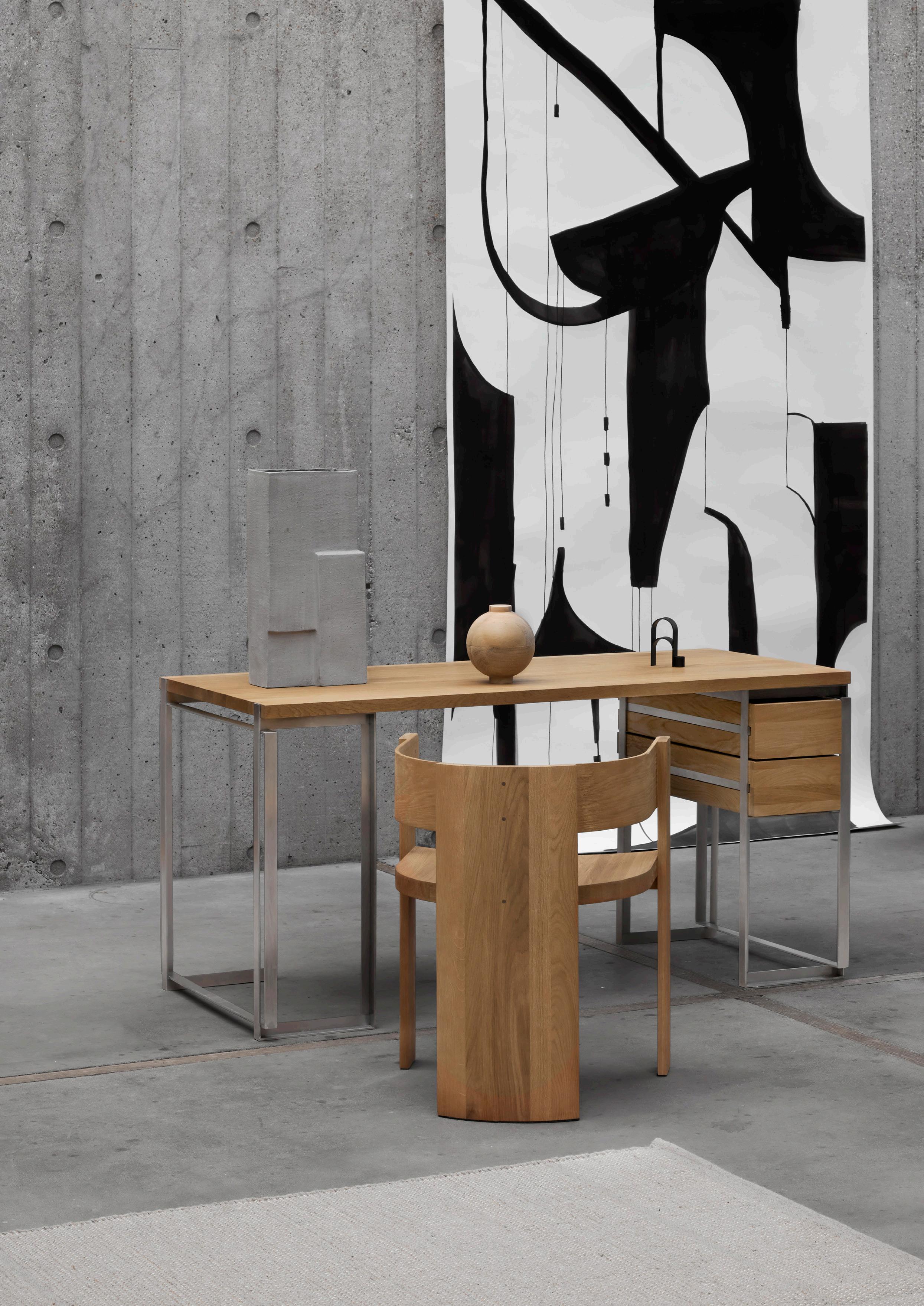 The Outline Desk was displayed beautifully, being the focus throughout our anniversary exhibition. The Outline Desk was articulated by a longing for a minimal essential space that pillars forward-thinking and outward-looking. The design exudes craft and humility with architectural clarity and grace with the understated details that reveal themselves upon closer inspection. Sleek lines create a graphic interplay of steel frames that holds the solid oak tabletop and drawers, giving the Outline Desk a classic yet contemporary look.