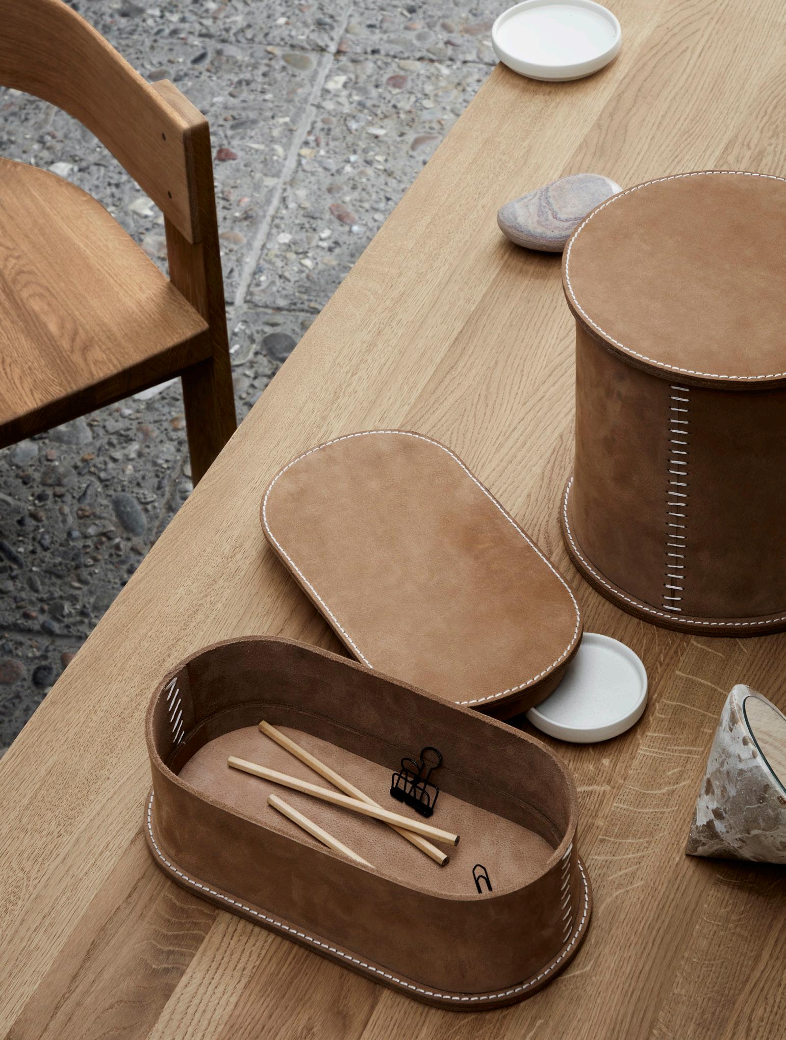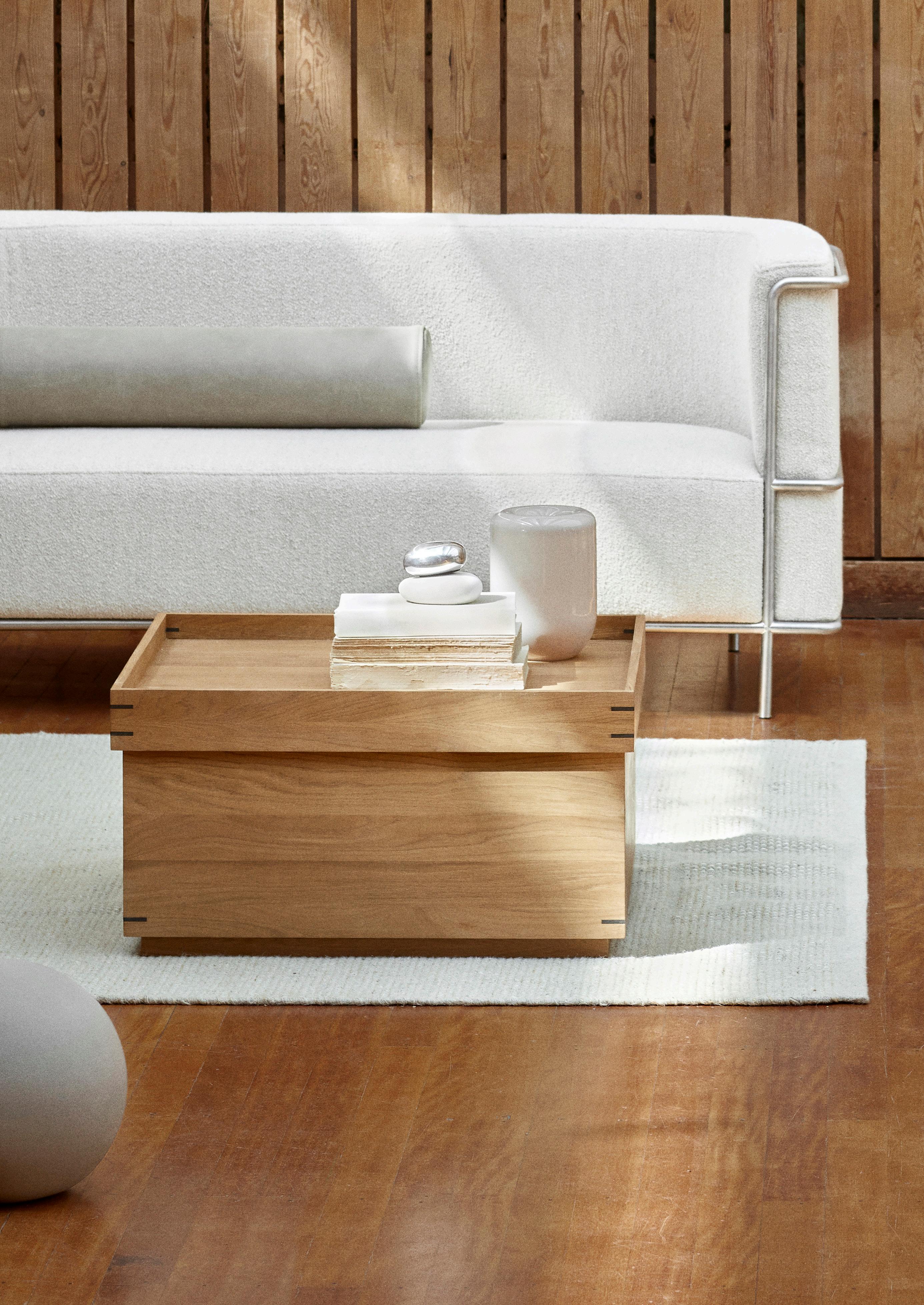 Inspired by the Japanese design tradition and the incense boxes of the Edo era, Kristina Dam Studio has envisioned a Scandinavian take on versatile tray tables. Three sizes, multiple functions, one clean look. The rectangular table turns into a luxurious bench or stylish seat when topped with the fitted cushion ’in delicious cognac nubuck. Our tables and trays are handcrafted in oak and treated oiled oak. The trays are now also available in a beautiful oiled smoked oak.