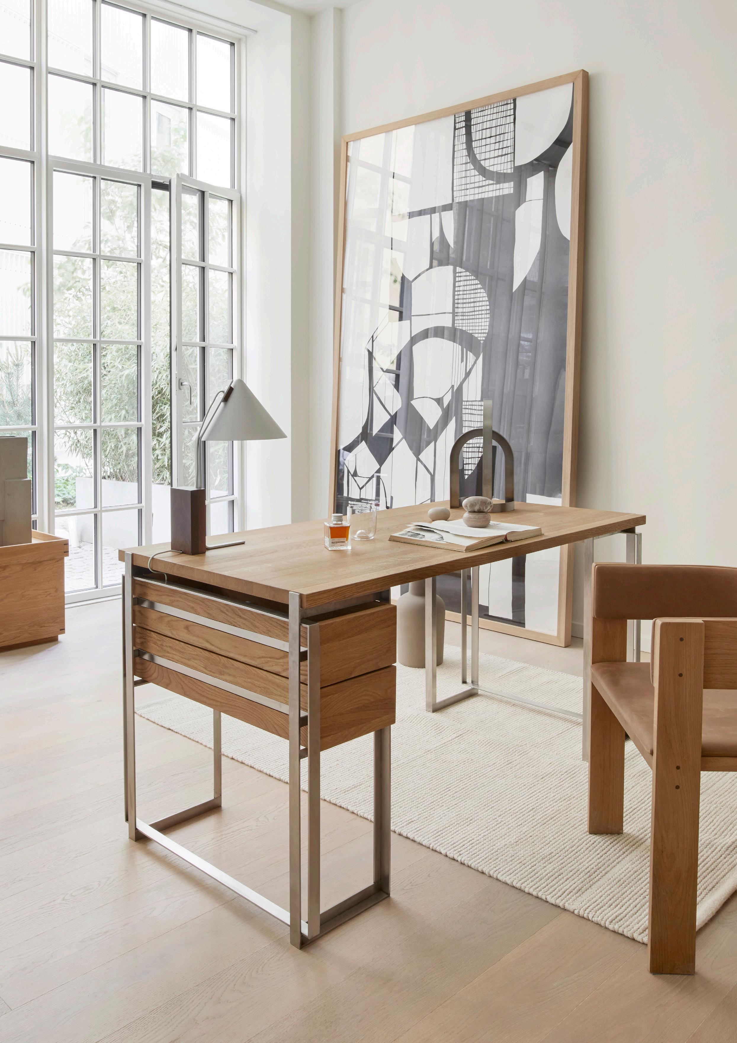 The Outline series was articulated by a longing for a minimal essential space that pillars forward-thinking and outward-looking. The design exudes craft and humility with architectural clarity and grace with the understated details that reveal themselves upon closer inspection. Sleek lines of the Outline Desk create a graphic interplay of steel frames that holds the solid oak tabletop and drawers, giving the desk a classic yet contemporary look. With its airy frame, the Outline chair has a sculptural and minimal expression that creates a distinctive atmosphere. The clean and simple lines form the chair’s frame, making it a modern sculptural chair that complements the workspace, dining area and contemporary spaces. Beautiful from any angle and crafted from high-quality materials, the Outline series are statement pieces ideal for standing freely in many spaces.