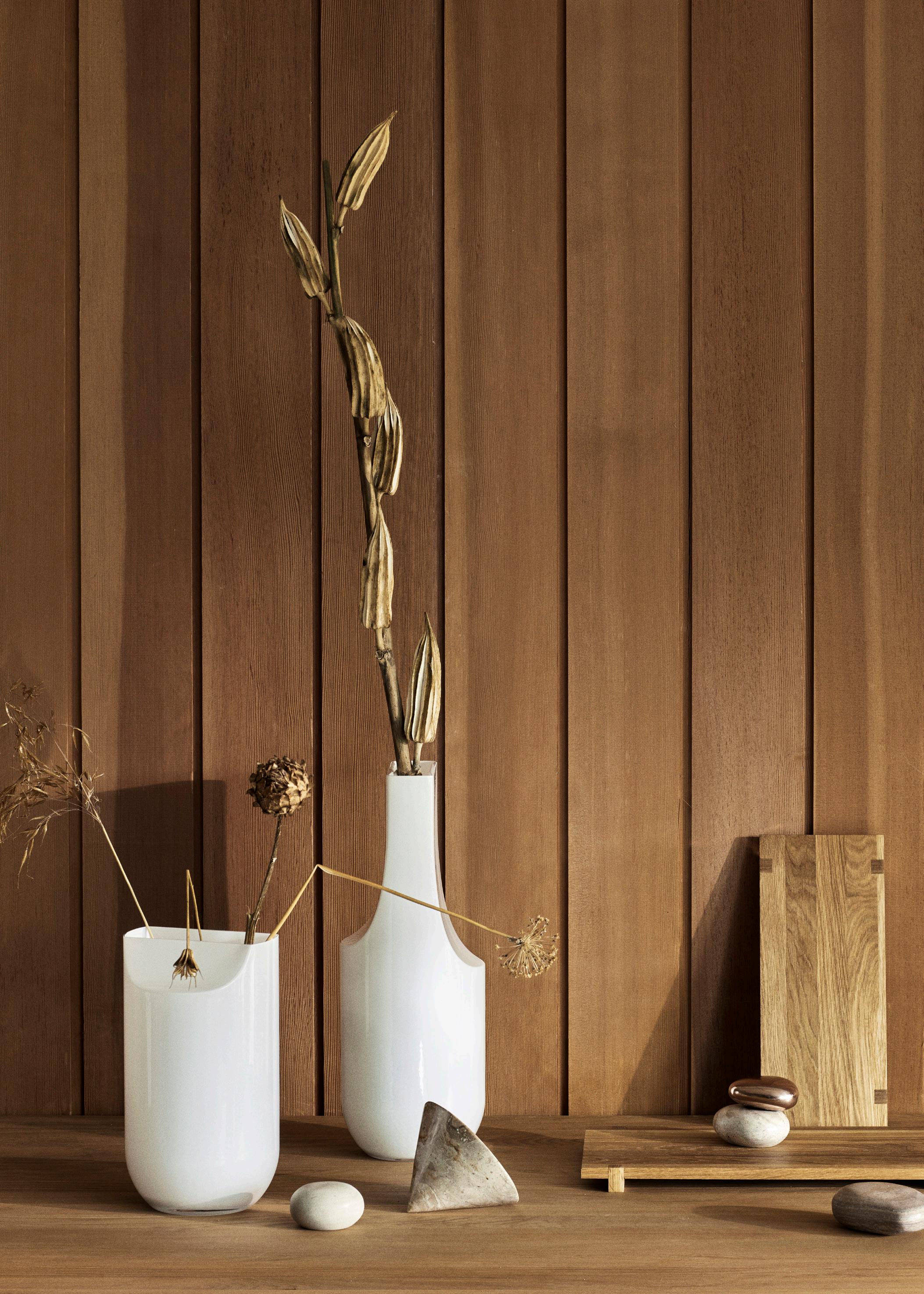 The Serif Glass vases are designed with subtle curves inspired by the serif known from typography. Simple curves are a signature to many Kristina Dam Studio designs and are no exception in creating the Serif Glass vases where the curve is unobtrusive. The vases are crafted from mouth-blown opal white glass and function as a sculpture or for displaying flowers graphically.