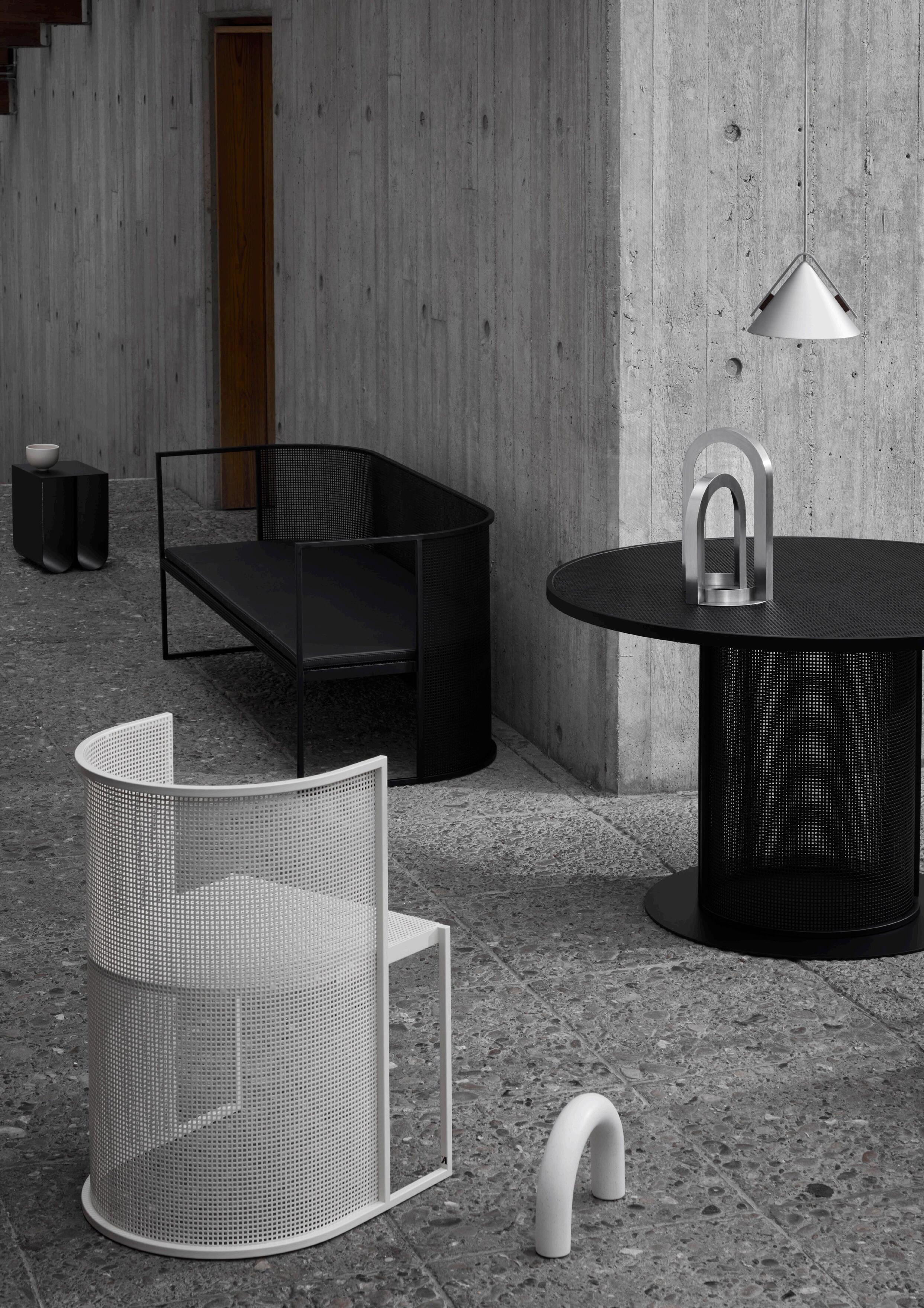 The Bauhaus tradition is focused on form following function. At Kristina Dam Studio, we embrace this ideology of simplicity whilst maintaining our insistence on an inherent sculptural quality to every piece of furniture we design. The Bauhaus series is defined by the perfectly arched backrests, the circle-shaped tables, and the understated adornment of the perforated grid. The resilient powder-coating makes the collection suited for indoor and outdoor use in private homes as well as cafés, restaurants, or urban spaces.