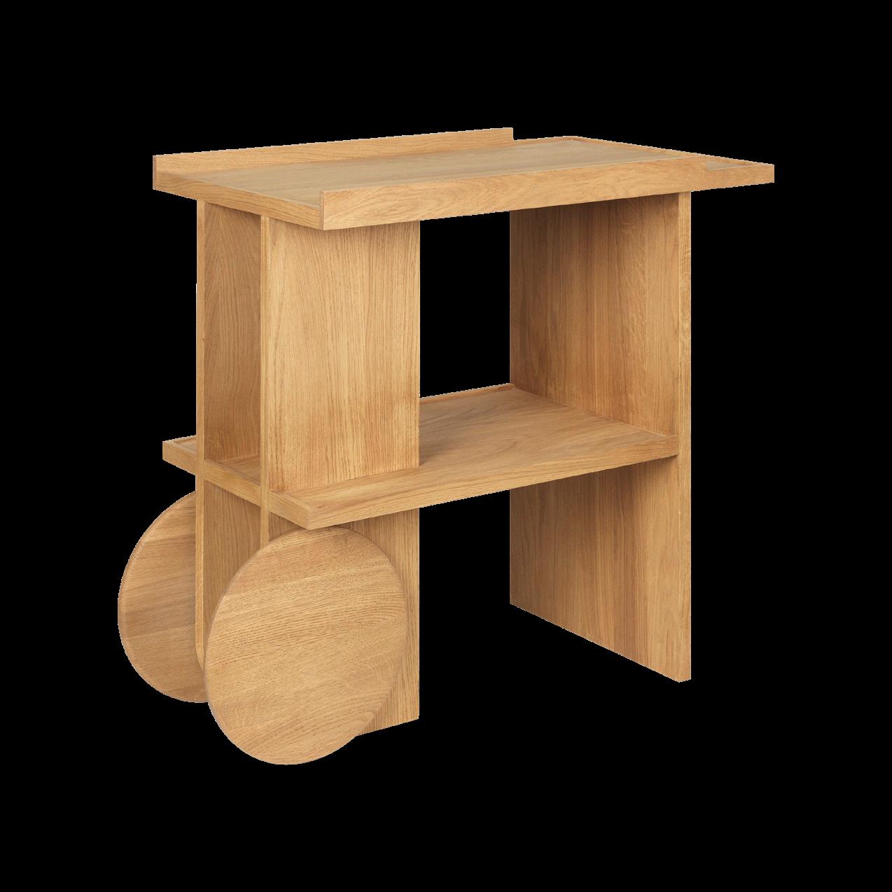 The design language of Axis Side Table is not about portability or typical visual and physical lightness. It results from an experiment on space between permeability and concealment. The design of the Axis Side Table consists of geometrical shapes that form a solid, timeless side table with references to the classic bar trolley. It is a solid piece of furniture that, with its expressive wheels, makes the side table a moveable object. The clean construction has an architectural and sculptural expression, showcasing the warmth of the wood. Design: Omayra Maymó.