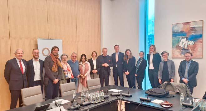 Former UN High Commissioner for Refugees Filippo Grandi and Jean-Nicolas Beuze, alongside members of the Fondation de Luxembourg’s network, at a meeting discussing the global refugee crisis in 2025.