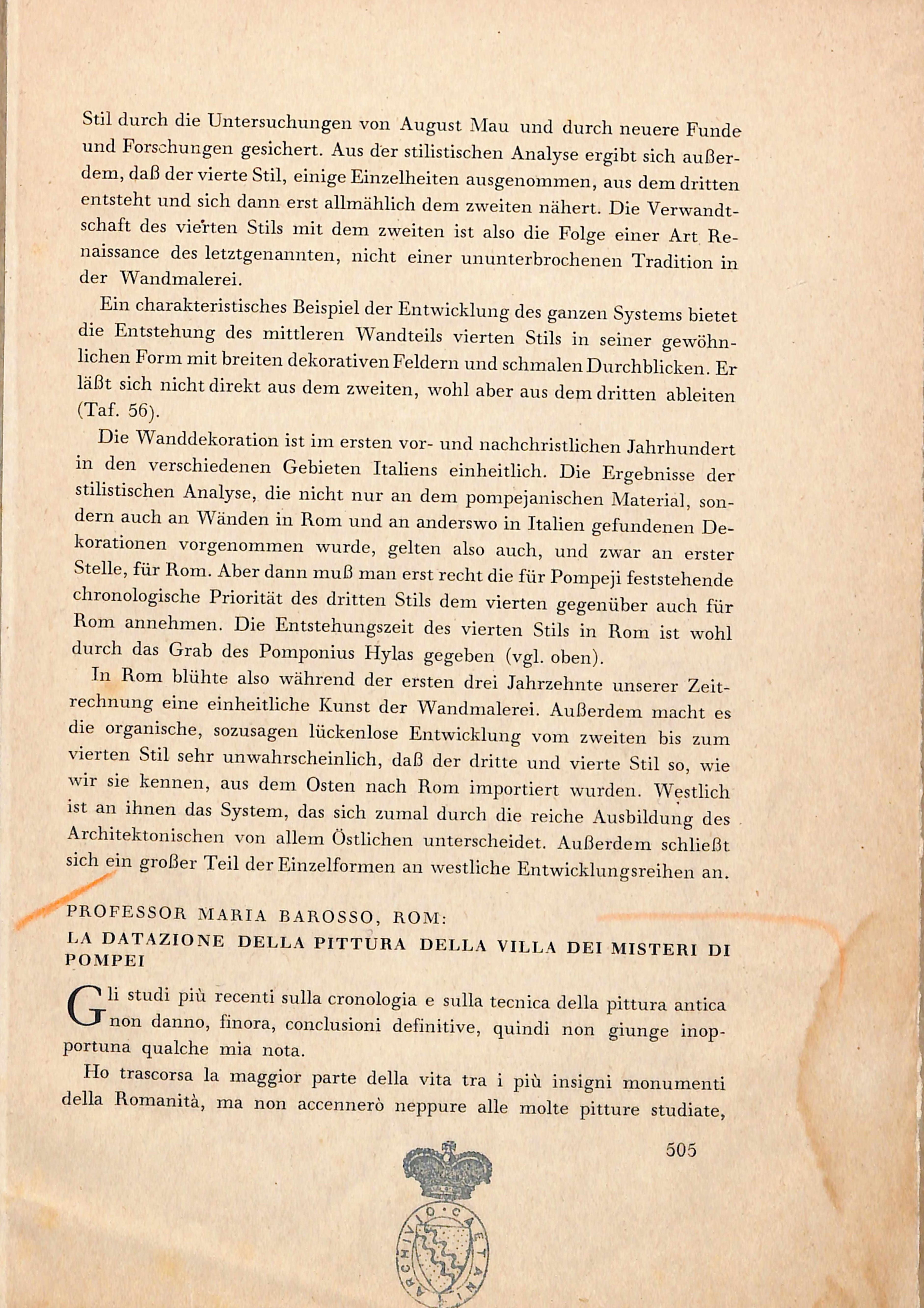 BAROSSO Maria, la datazione della pittura della villa dei misteri di Pompei, 1939
