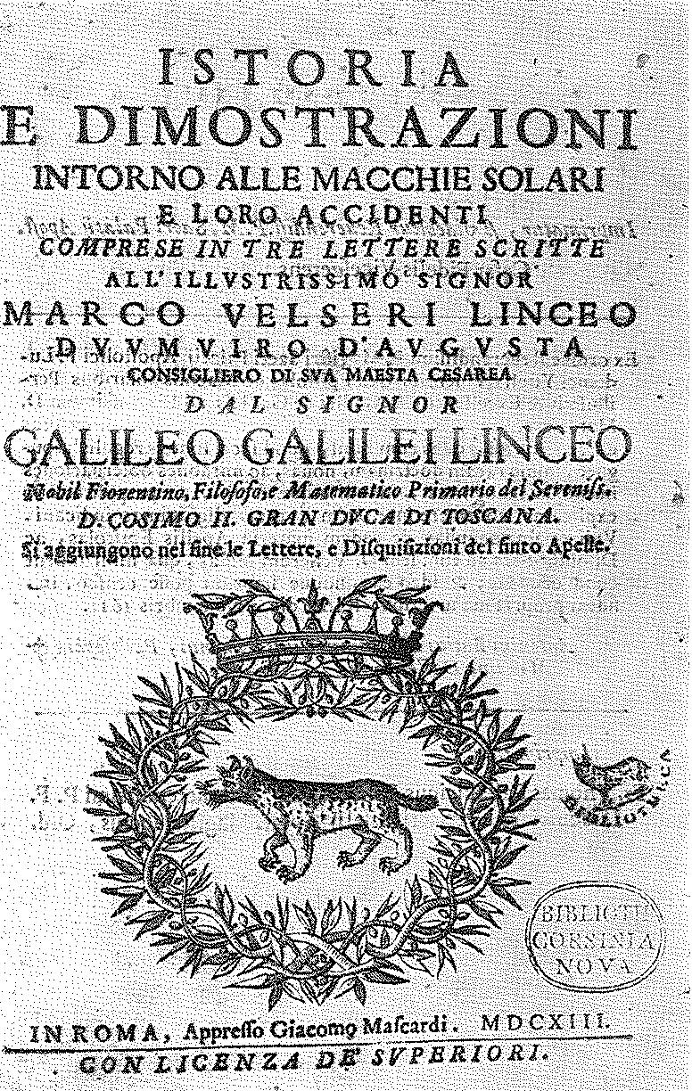 drammatici, conle autorità del tempo, ebbe ad affrontare quando Galileo entrò a farne parte e pubblicò, sotto il segno della Lince, l'opuscolo sulle macchie solari, e, più tardi, il Saggiatore eil Dialogo dei Massimi Sistemi.