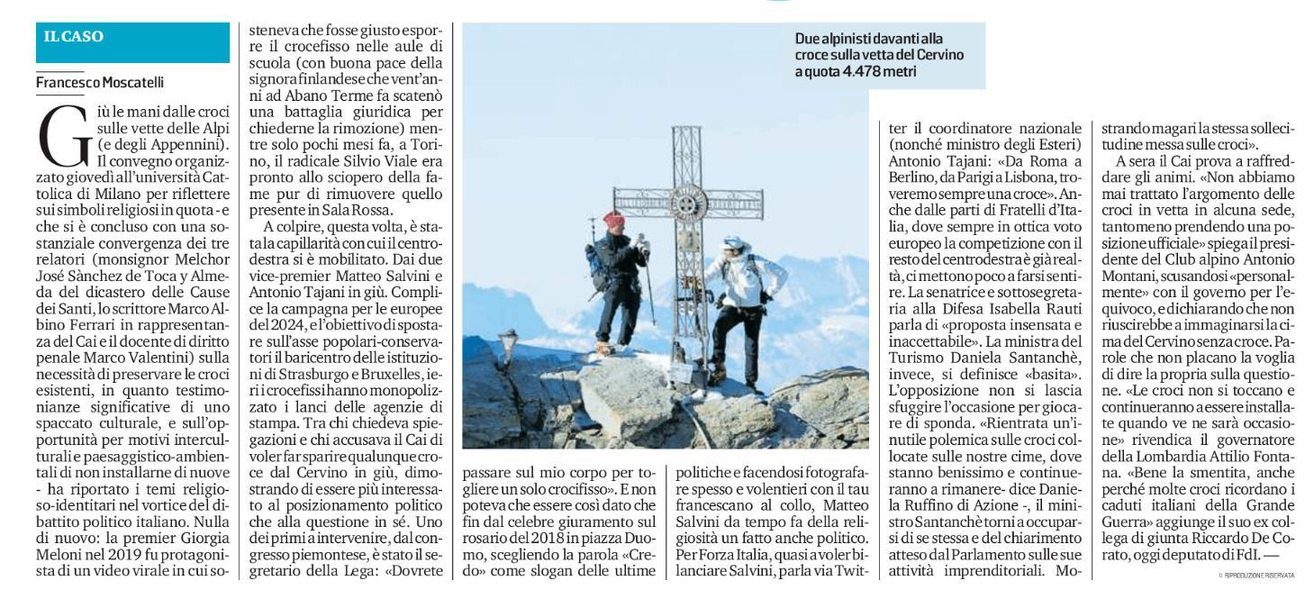 Il Comitato centrale di indirizzo e controllo parla di «notizia falsa», ricordando «di non aver mai trattato la questione né, men che meno, di aver mai emanato alcun atto in materia», si legge in una nota, riferendosi all’articolo, apparso sul sito, nel quale si garantiva il mantenimento delle croci già esistenti in quota, frenando su nuovi manufatti. Una posizione che aveva scatenato un vero terremoto salito agli onori della cronaca nazionale con dure prese di posizione sia da parte di politici che di esponenti del mondo dell’alpinismo. Poi domenica il presidente Montani era intervenuto per placare le polemiche precisando che «quanto pubblicato è frutto di dichiarazioni personali espresse dal direttore editoriale Marco Albino Ferrari durante la presentazione di un libro». La dichiarazione, però, aveva scatenato l’immediata reazione del direttore editoriale Marco Albino Ferrari e del curatore del sito internet Pietro Lacasella (il primo chiamato in causa dallo stesso presidente Montani, il secondo autore di un articolo sul web proprio sul tema delle croci di vetta) che avevano presentato le proprie dimissioni. Mentre i collaboratori de «Lo Scarpone » (il portale online del Cai) avevano proclamato lo sciopero in segno di protesta.