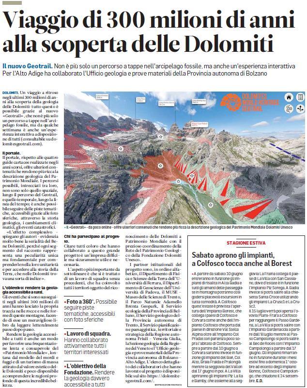 È online il nuovo portale della geologia delle Dolomiti Patrimonio Mondiale, il Dolomites World Heritage Geotrail (dolomitesgeotrail.com). I percorsi possibili, intrecciati tra loro, non sono solo quello spaziale, lungo il percorso del Geotrail, e quello temporale. C’è la possibilità di seguire delle piste tematiche, attraverso i cambiamenti climatici e gli eventi catastrofici. (m.g. )