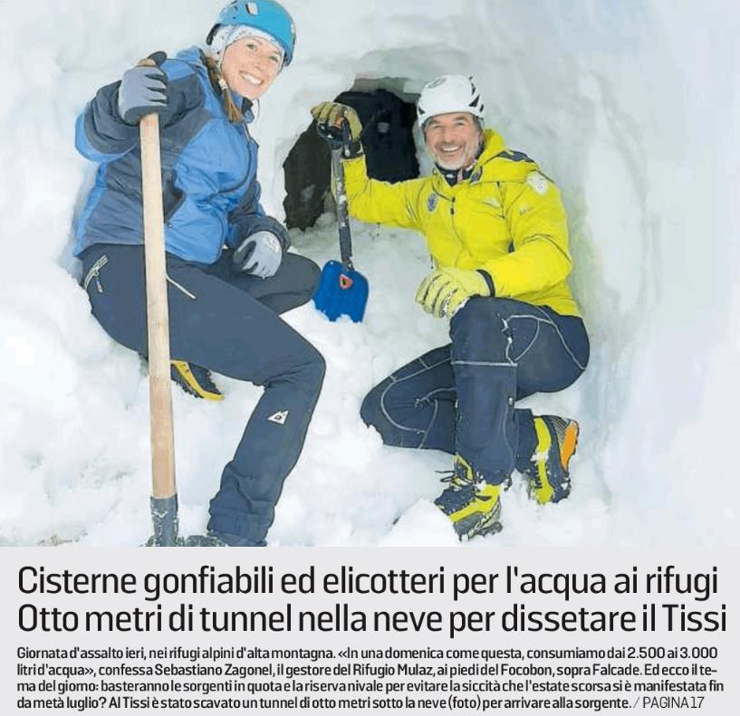 Dall'altra parte della parete opera il rifugio Vazzoler. La famiglia Corazza, che lo gestisce, non è preoccupata come lo scorso anno. «Di pioggia ne è arrivata fino a due giorni fa. E l'ultima neve riesce a mantenersi, grazie alle temperature notturne che anche nelle ultime notti si sono mantenute intorno allo zero». Un anno fa una delle due sorgenti s'era inaridita. «Un anno fa? L'estate 2022 la ricordiamo come un incubo – ammette dal Mulaz il gestore Zagonel -, non solo perché ai primi di luglio non c'era il filo di neve, ma anche perché portare l'acqua con l'elicottero ci poteva costare dai 300 ai 400 euro a chiamata e a "rotazione". E, si badi, a causa del caldo, la macchina non era in grado di trasportare più 850 litri al giro». L'acquedotto del Mulaz, come da sempre, attinge dalla neve percolante. E per fortuna in questi giorni i nevai sono ancora abbondanti.