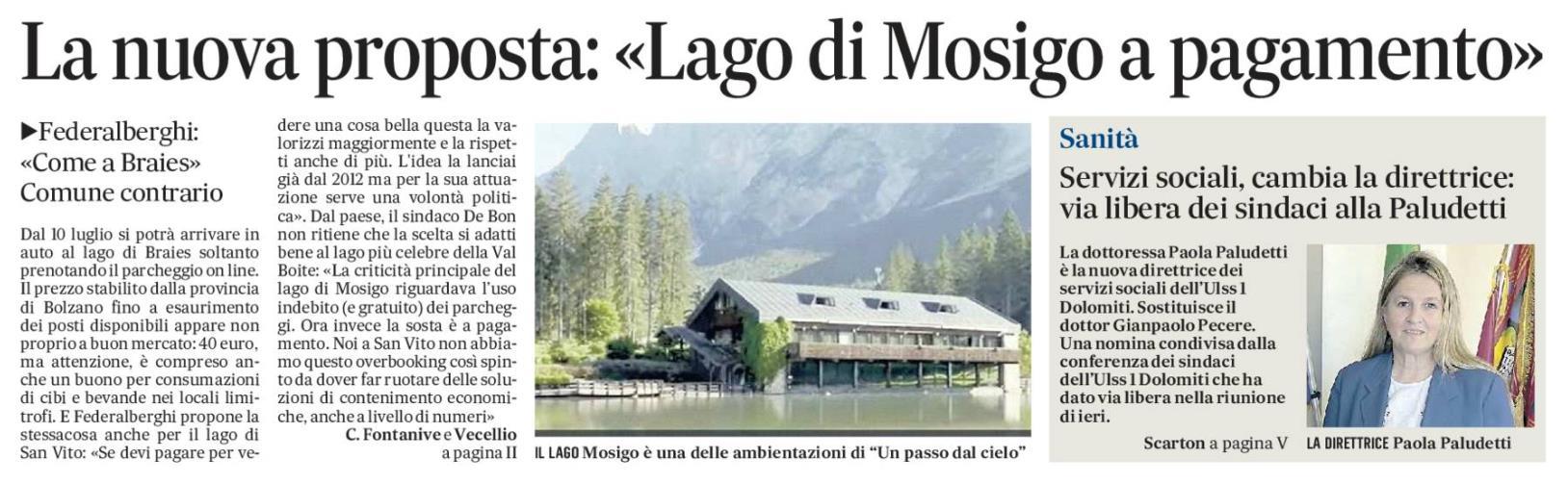 Il lago in questione è stato letteralmente preso d'assalto dai turisti anche per il successo della fiction Rai "Un Passo dal Cielo" che negli anni passati ha avuto come set proprio lo specchio d'acqua alto atesino, mentre si attende la trasmissione delle nuove puntate della serie tv, le cui riprese anche in quest'occasione sono state girate come da qualche anno a questa parte tra i boschi del Cadore e in particolare nel lago di Mosigo, in comune di San Vito. «Il ticket d'ingresso in questo lago - prosegue De Cassan - potrebbe essere un'idea visto il successo della fiction tv e di conseguenza il possibile aumento di afflusso turistico in tale luogo. Acquisterebbe valore il lago e anche tutta la località turistica e magari potrebbe accrescere anche le prenotazioni nelle strutture alberghiere. Attenzione però perché ciò che pago deve essermi restituito nei servizi accessori e infrastrutture di prim'ordine, come i parcheggi, i punti di ristoro o le aree pic nic».