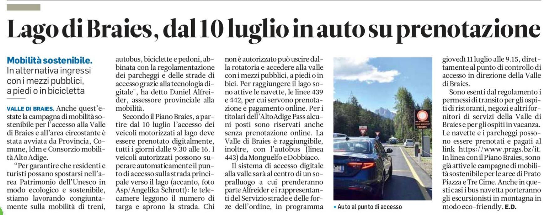 La nuova stagione degli accessi regolamentati dalla prenotazione obbligatoria online alla Valle di Braies ed al suo famoso lago è ripartita mercoledì 10 luglio con due giornate di splendido sole, prima della nuvolosità con abbondanti piogge che ha solo parzialmente frenato gli afflussi dei giorni precedenti. Fin dalla prima giornata di regolamentazione, tutti i maggiori responsabili istituzionali dei servizi della Provincia e delle Forze dell’ordine hanno avuto modo di aderire all’invito dell’assessore alla Mobilità Daniel Alfreider e del sindaco di Braies Friedrich Mittermair per constatare di persona come il sistema di controllo digitale degli accessi al Lago di Braies sia di nuovo attivo e funzionante e come la gestione della mobilità sia partita correttamente. E per tutto il finesettimana il parcheggio adiacente al lago è già tutto esaurito.