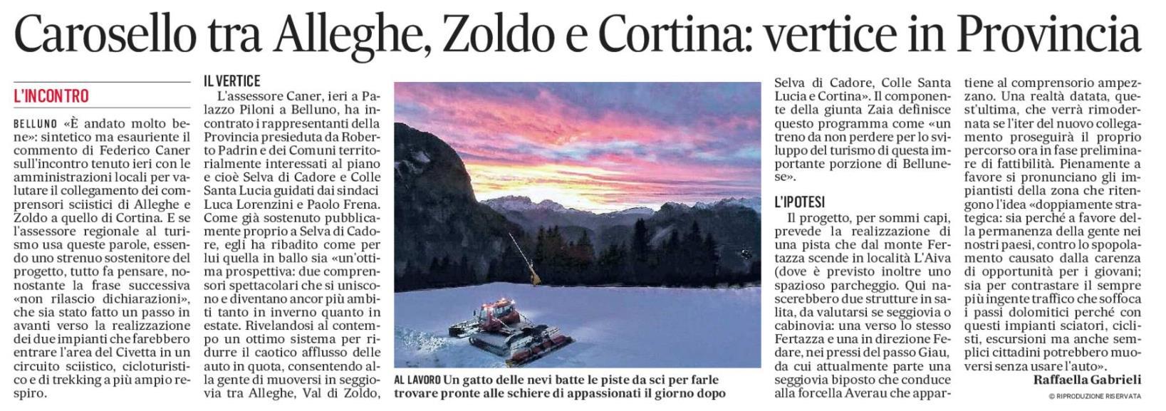 Dal mondo dell'impiantistica è un sì corale quello che si alza al cospetto del progetto regionale di collegare i comprensori sciistici di Alleghe-Zoldo con quello di Cortina. Sulla scia di quanto affermato a Selva di Cadore dall'assessore al turismo Federico Caner, gli imprenditori sostengono che quello in corsa sia un treno da non perdere. E non solo per ragioni economiche delle società interessate, ma anche per creare nuovi posti di lavoro e frenare così lo spopolamento in atto. «Ci appelliamo alle istituzioni viene sottolineato affinché comprendano la valenza di questo percorso per le nostre vallate e non ne ostacolino la prosecuzione».