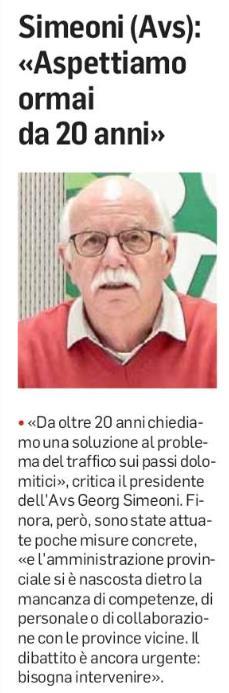 «Premetto: anche per me c'è troppo traffico e soprattutto troppo traffico di macchine e moto che non si tiene alle regole. Ma per quanto riguarda la richiesta di una chiusura temporanea dei passi voglio immaginare che nessuno pensi a una chiusura totale, giusto? Perché ci saranno persone che avranno in ogni caso il diritto di passare (rifugisti, chi lavora da una e dall'altra parte di un passo, trasporto pubblico). Pertanto, posso solo ripeterlo ancora una volta: anche per una teorica chiusura servirebbe un sistema di gestione». Che cosa intende?