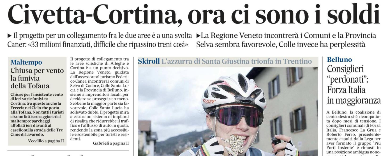 Ad attendere di approfondire in maniera circostanziata i preliminari di fattibilità è Enrico Pirollo, presidente della Val Fiorentina spa, che amministra gli impianti di risalita nel comune di Selva di Cadore. «Il nostro parere favorevole è scontato ovviamente dichiara . A questo punto non ci resta che esaminare le soluzioni proposte dalla Regione, in termini ambientali ma anche di gestione futura, che significa, ad esempio, fare delle previsioni di sostenibilità economica e comprendere il futuro assetto societario da individuare. Dopo l'imminente confronto che Venezia avrà con i Comuni di Selva di Cadore e di Colle Santa Lucia e con la Provincia di Belluno, ci rendiamo disponibili a un incontro con spirito proattivo e collaborativo».