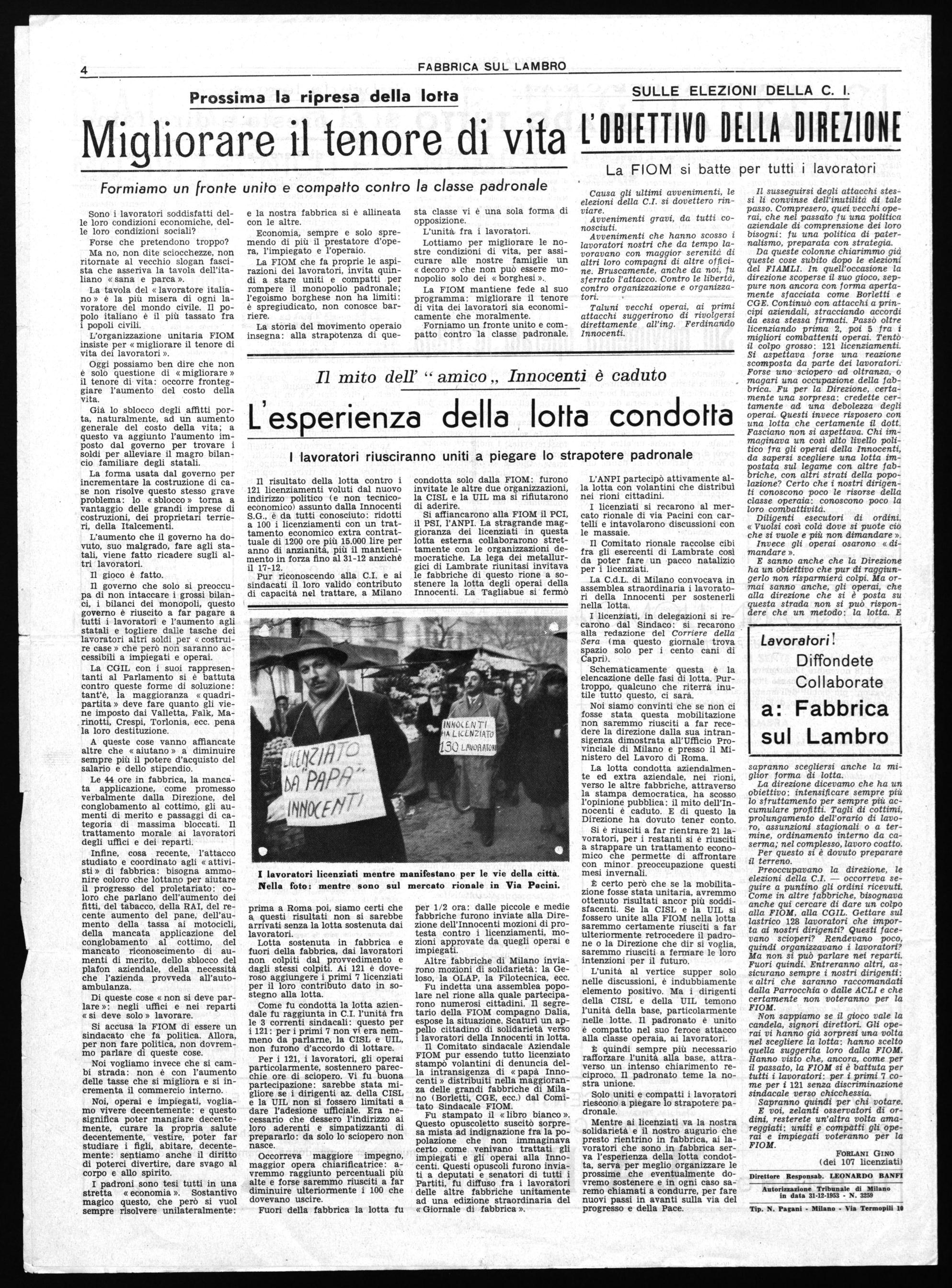 Il Comitato sindacale Aziendale FIOM pur essendo tutto licenziato stampò volantini di denuncia della intransigenza di « papà Innocenti » distribuiti nella maggioranza delle grandi fabbriche di Milano ( Borletti, CGE, ecc.) dal Comitato Sindacale FIOM.