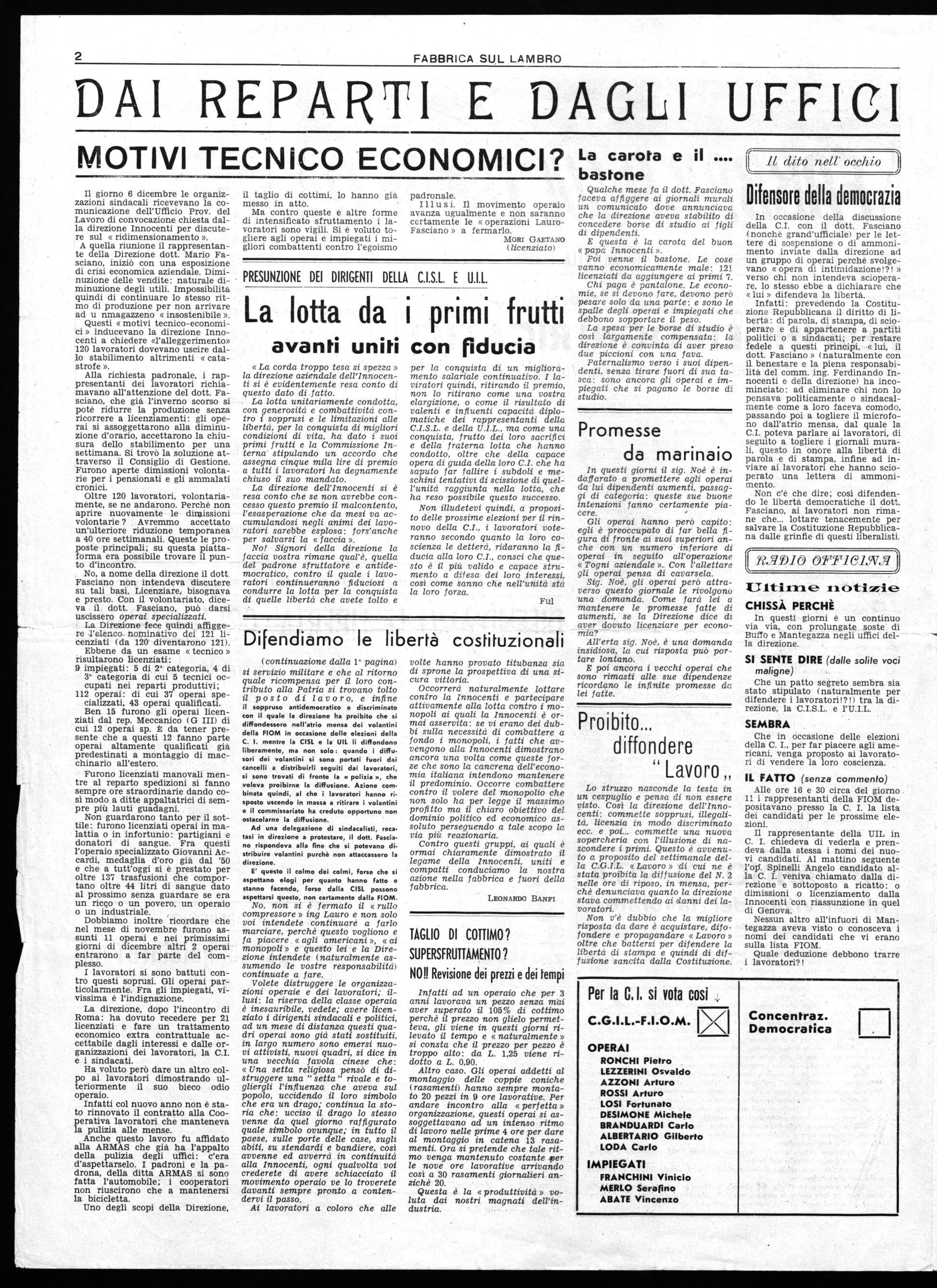 Non ì molto ma non e neppure poco se consideriamo il clima che si è creato nella fabbrica da alcuni mesi in qua. « Fabbrica sul Lambro » è stato un foglio ben accetto da parte dei lavoratori che lo hanno accolto e sostenuto con favore perchè esso è l'eco della loro stessa voce. Gli operai, i tecnici, gli impiegati hanno espresso ed esprimono attraverso le sue pagine, ciò che liberamente volevano e vogliono dire anche se, per ciò sono sorte delle « grane » per il Direttore Responsabile.