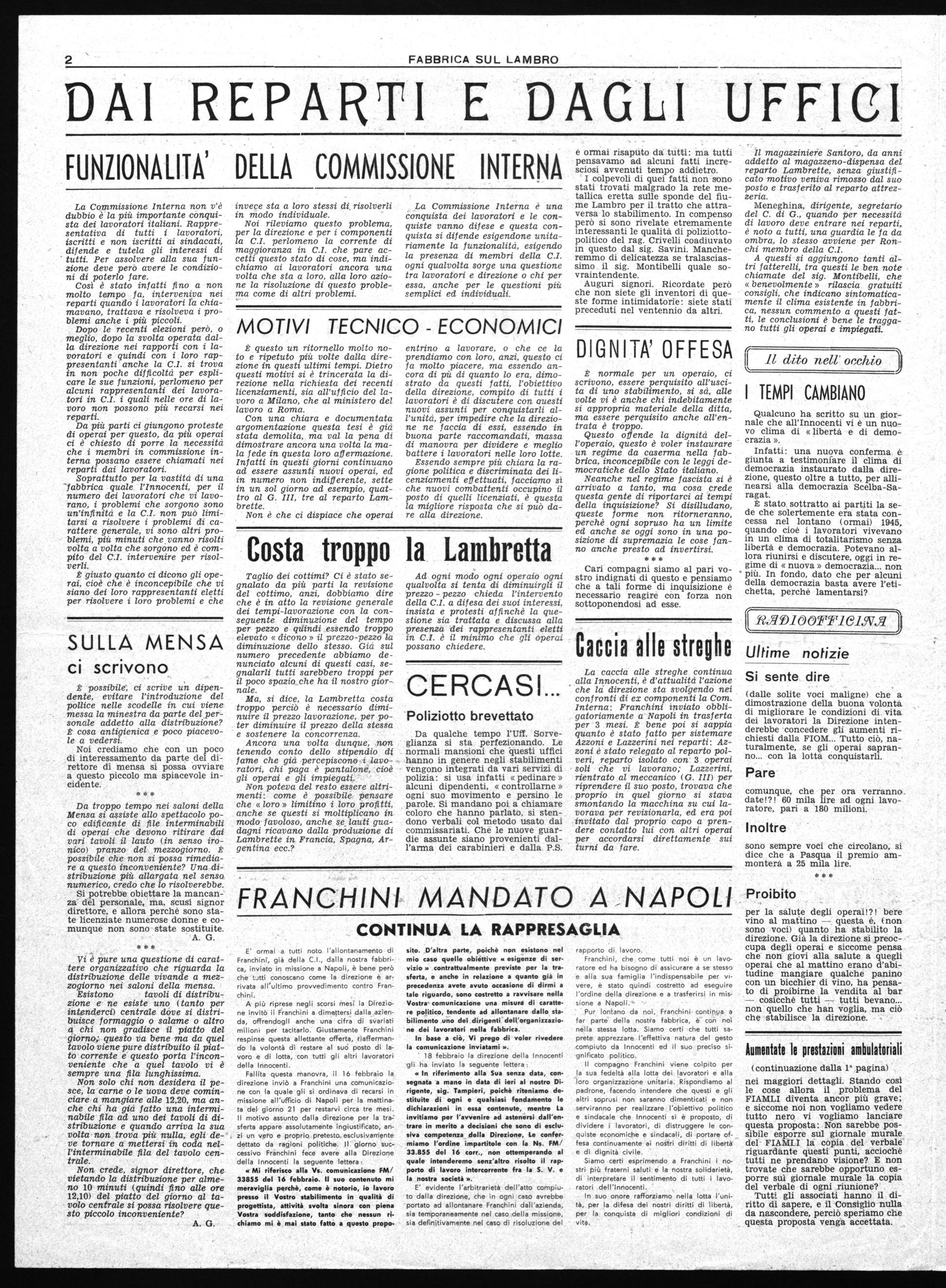 I colpevoli di quei fatti non sono stati trovati malgrado la rete metallica eretta sulle sponde del fiume Lambro per il tratto che attraversa lo stabilimento. In compenso però si sono rivelate etremamente interessanti le qualità di poliziottopolitico del rag. Crivelli coadiuvato in questo dal sig. Savini. Mancheremmo di delicatezza se tralasciassimo il sig. Montibelli quale sovraintendente. Auguri signori. Ricordate però che non siete gli inventori di queste forme intimidatorie: siete stati preceduti nel ventennio da altri.