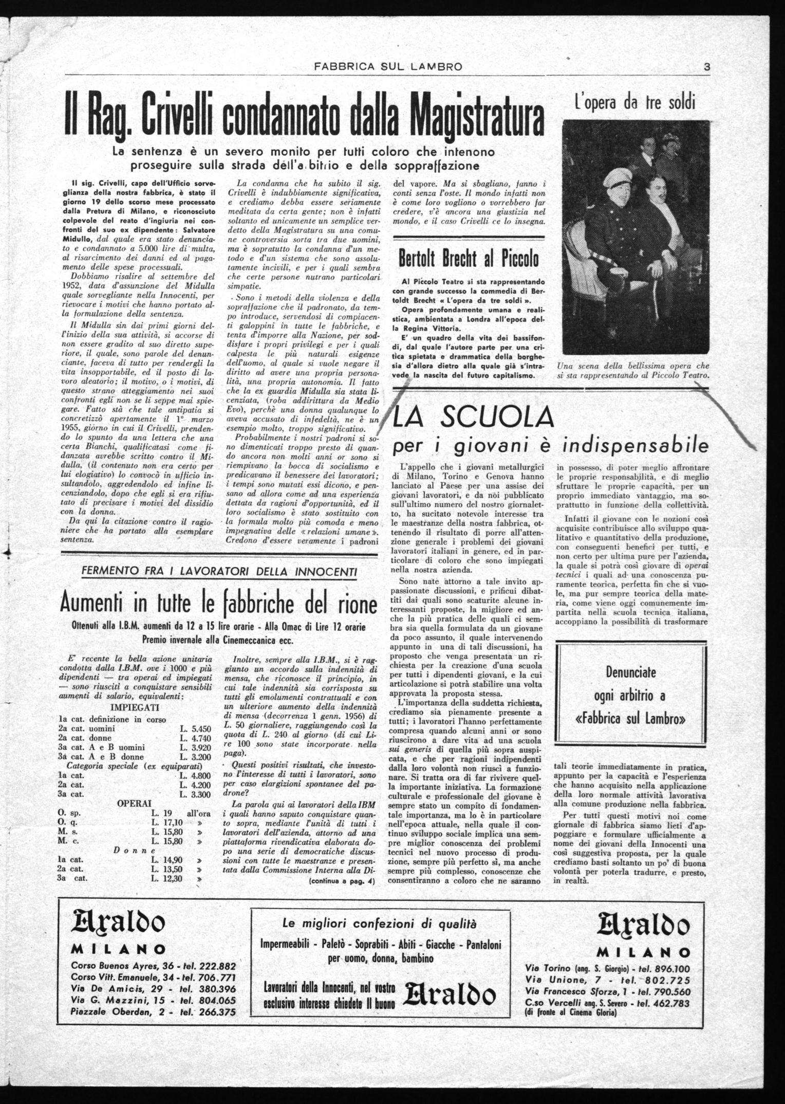 Il sig. Crivelli, capo dell'Ufficio sorveglianza della nostra fabbrica, è stato il giorno 19 dello scorso mese processato dalla Pretura di Milano, e riconosciuto colpevole del reato d'ingiuria nei confronti del suo ex dipendente: Salvatore Midullo, dal quale era stato denunciato e condannato a 5.000 lire di'multa, al risarcimento dei danni ed al pagamento delle spese processuali.