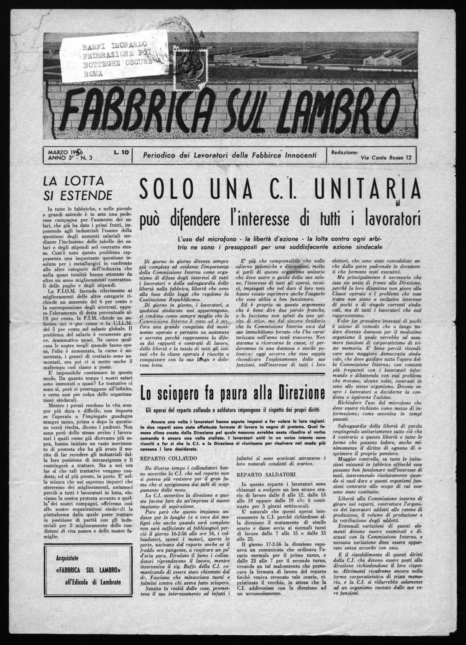 MARZO 1956 ANNO 3° - N. 3 L. 10 Redazione: Periodico dei Lavoratori della Fabbirca Innocenti Via Conte Rosso 12 B ADLC I TE ON E DER ItZ CS E Ft:4kt., B OTTEGHE OSCURI` RODA