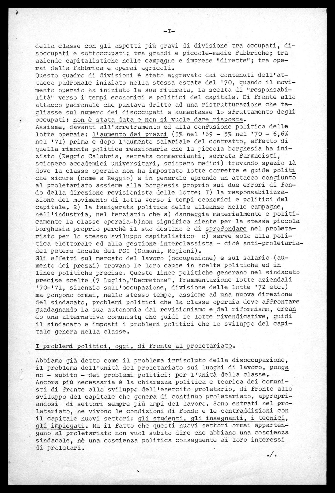 Così possiamo avere ideologia reazionaria tra gli insegnanti, tendenze anarchiche ed individualiste tra gli studenti, i tecnici, gli impiegati: con manifestazioni volta a volta corporative, estremistiche etc.= Non è certo il revisioniamo o il riformismo che possono dare una risposta a questi nuovi settori proletarizzati. Riformismo e revisionismo hanno di continuo mistificato l'esigenza fondamentale rivoluzionaria dei settori tradizionali del proletariato - come la classe operaiae assieme hanno portato avanti una logica sindacale che invece di legarsi ad un discorso rivoluzionario, di emancipazione degli sfruttati, si basa su esigenze immediate, corporative, su divisioni di fatto del proletariato e su divisioni politiche imposte dai padroni (vale per tutti in fabbrica il discorso sulle categorie e, oggi, in generale la rinuncia ad una battaglia generale per l'occupazione).
