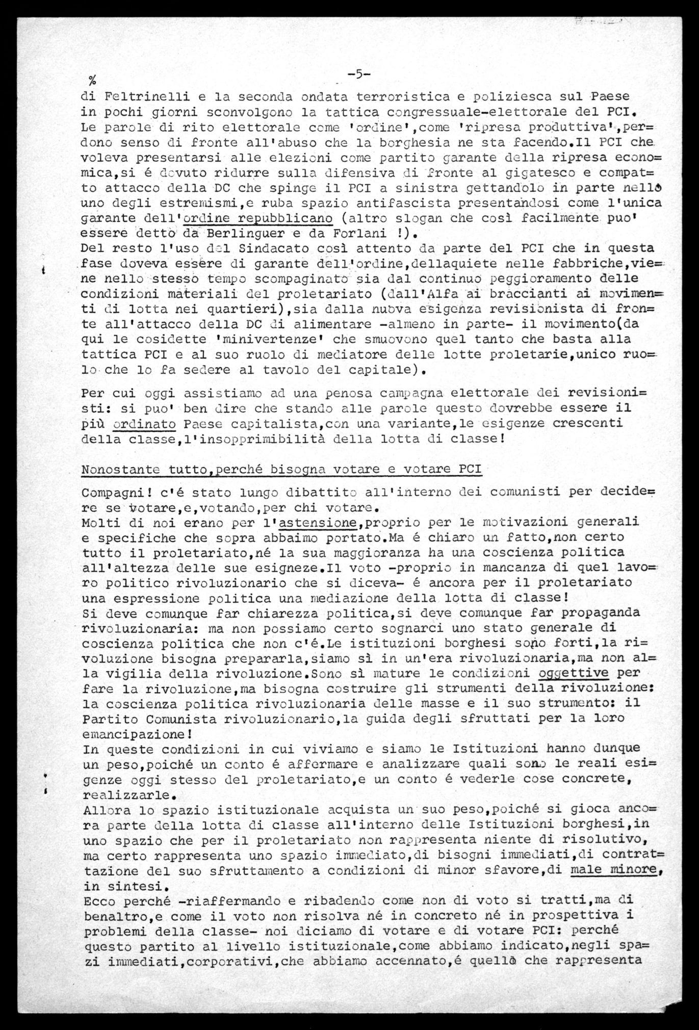 Ecco perché -riaffermando e ribadendo come non di voto si tratti,ma di benaltro,e come il voto non risolva né in concreto né in prospettiva i problemi della classe- noi diciamo di votare e di votare PCI: perché questo partito al livello istituzionale,come abbiamo indicato,negli spa= zi immediati,corporativi,che abbiamo accennato,é quella che rappresenta
