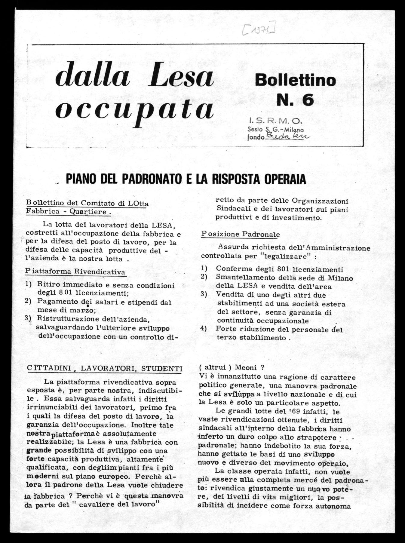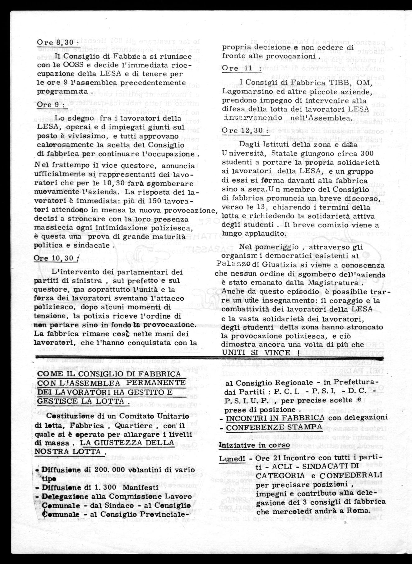 Ecco perchè quindi, i lavoratori della Lesa e le Organizzazioni-Sindacali e i movimenti pólitici che formano 2. Comitato di lotta fabbrica-quartiere, chiedono la solidarietà attiva di tutti i lavoratori, degli studenti, dei cittadini; la nostra lotta è la lotta di voi tutti, giacchè il nemico è lo stessa , è il padronato con la sua politica di oppressione e di sfruttamento nei confronti delle masse popolari .