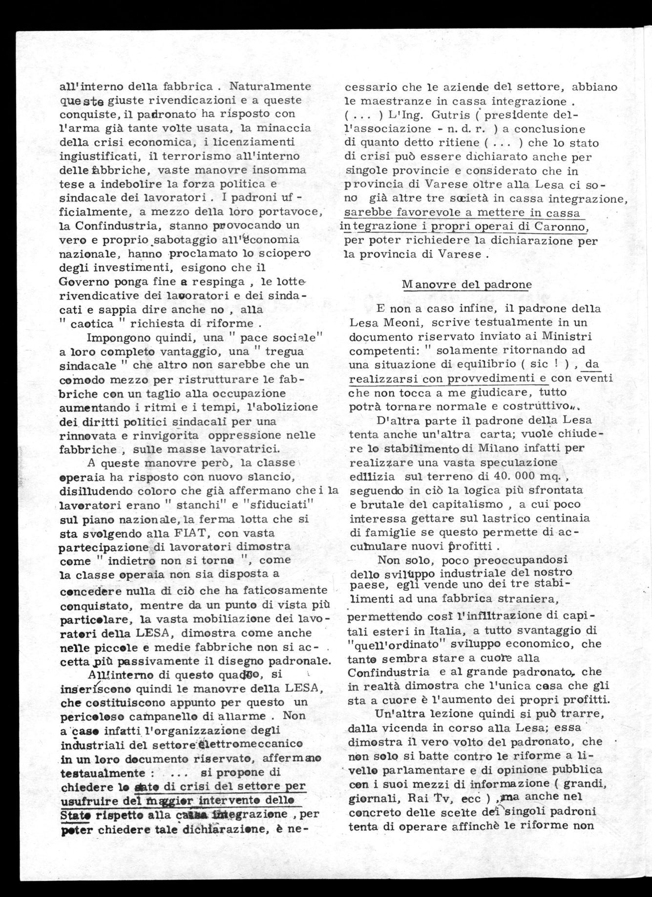 A queste manovre però, la classe operaia ha risposto con nuovo slancio, disilludendo coloro che già affermano che i la lavoratori erano " stanchi" e "sfiduciati" sul piano nazionale, la ferma lotta che si sta svolgendo alla FIAT, con vasta partecipazione di lavoratori dimostra come " indietro non si torna ", come la classe operaia non sia disposta a concedere nulla di ciò che ha faticosamente conquistato, mentre da un punto di vista più particolare, la vasta mobiliazione dei lavoratori della LESA, dimostra come anche nelle piccole e medie fabbriche non si ac- . setta ,più passivamente il disegno padronale. AllUntern.o di questo quadro, si inseriscono quindi le manovre della LESA, che costituiscono appunto per questo un pericoloso campanello di allarme . Non a 'caso infatti l'organizzazione degli industriali del settoretlettromeccanico in un loro documento riservato, affermalo testaualmente : ... si propone di chiedere lo alato di crisi del settore per usufruire del tnaggior intervento dello Stato rispetto alla caiiiiiittiograzione , per poter chiedere taledichiarazione, è ne-