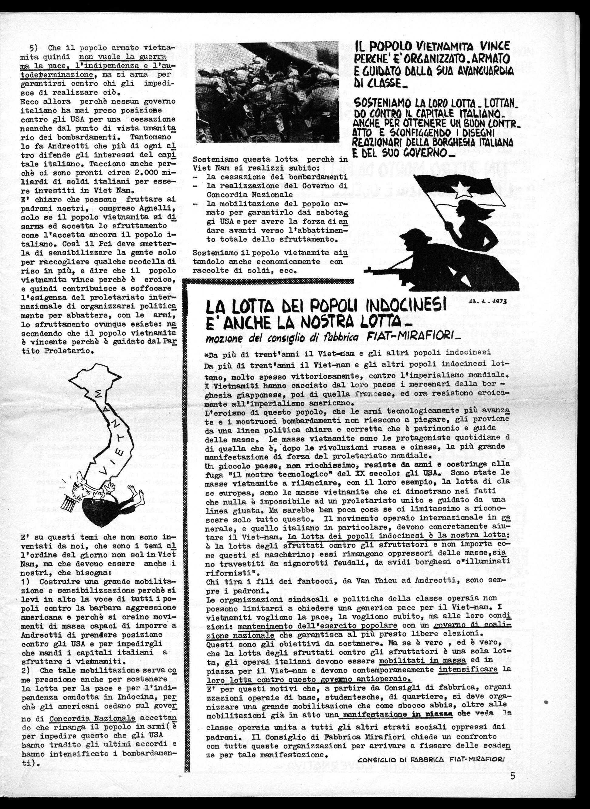 Costruire una grande mobilitazione e sensibilizzazione perchè si levi in alto la voce di tutti i popoli contro la barbara aggressione americana e perchè si creino movimenti di massa capaci di imporre a Andreotti di prendere posizione contro gli USA e per impedirgli che mandi i capitali italiani a sfruttare i vietnamiti.