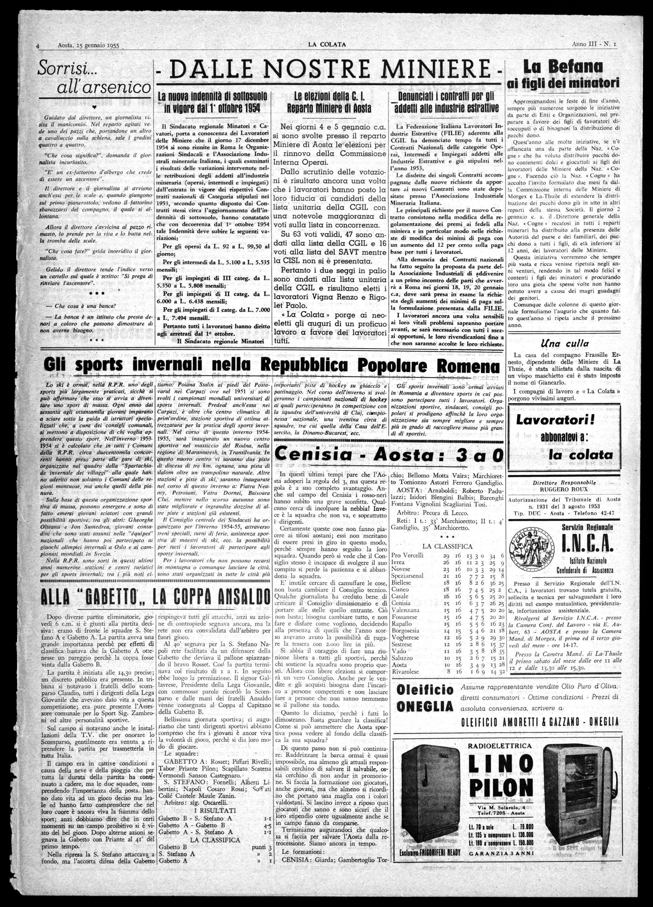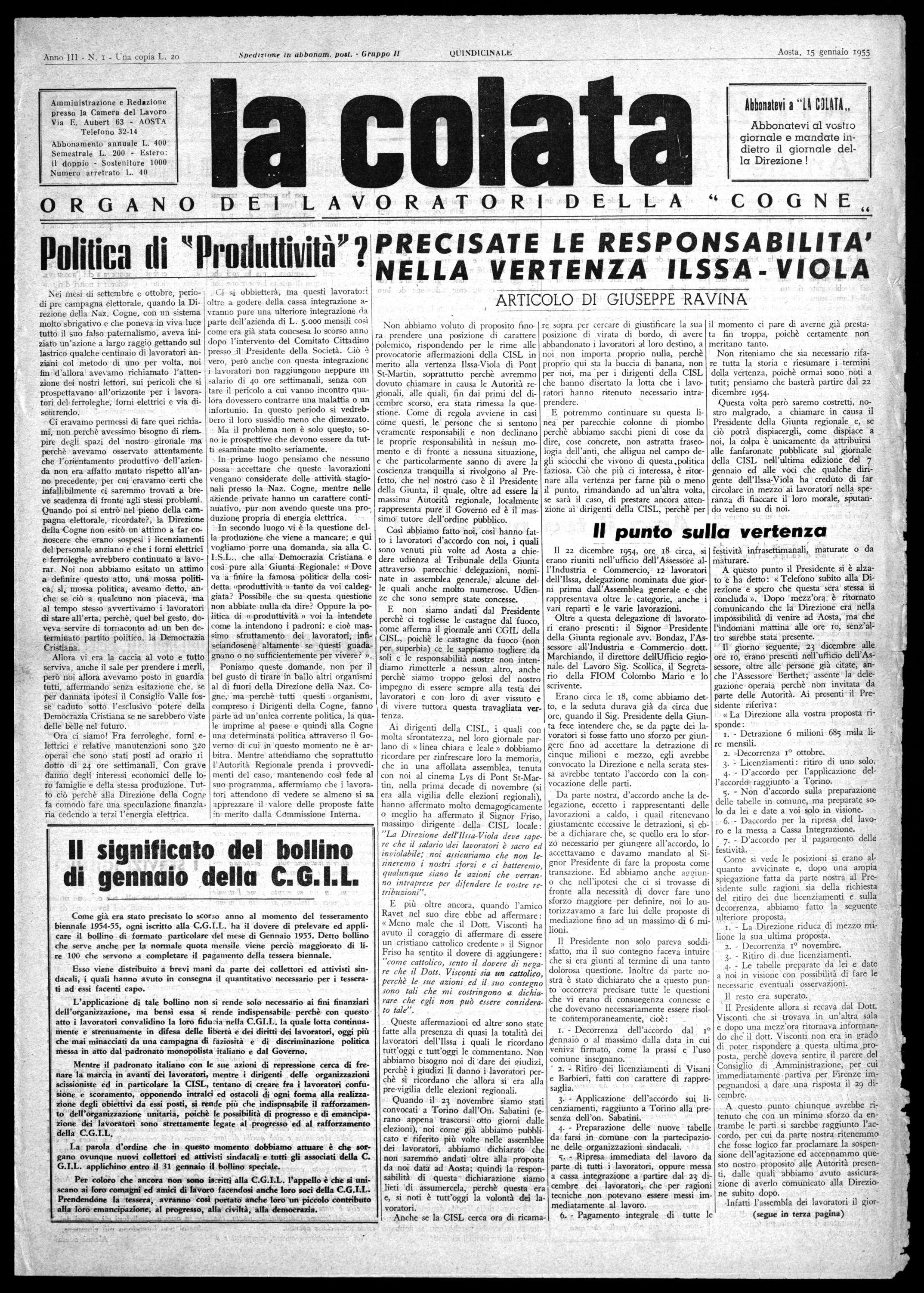 Ai dirigenti della CISL, i quali con molta sfrontatezza, nel loro giornale parlano di « linea chiara e leale » dobbiamo ricordare per rinfrescare loro la memoria, che in una affollata assemblea, tenuta con noi al cinema Lys di Pont St-Martin, nella prima decade di novembre (si era alla vigilia delle elezioni regionali), hanno affermato molto demagogicamente meglio ha affermato il Signor Friso, massimo dirigente della CISL locale: "La Direzione delrllssa-Viola deve sapere che il salario idei lavoratori è sacro ed inviolabile; noi assicuriamo che non lesineremo i nostri sforzi e ci batteremo, qualunque siano le azioni che verranno intraprese per difendere le vostre retribuzioni".