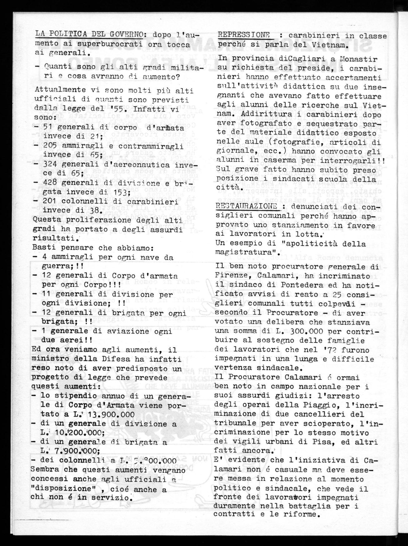 Il C.d.F.' dell'Alfa Romeo denuncia ancora una volta gli atti repressivi del governo fascista greco nei confronti di due studenti che si battevano per la libertà e la democrazia nell'università e nel paese i quali sono stati oggetto di atroci torture fisiche che li hanno portati alla morte.