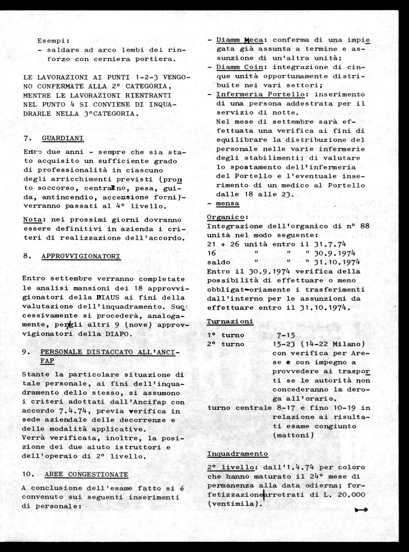 2° livello: dall'1.4.74 per coloro che hanno maturato il 24° mese di permanenza alla data odierna; forfetizzazion+rretrati di L. 20.000 (ventimila).
