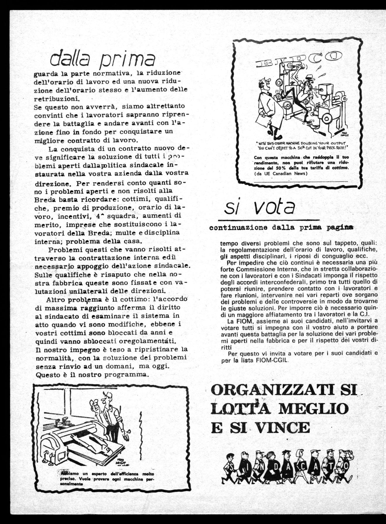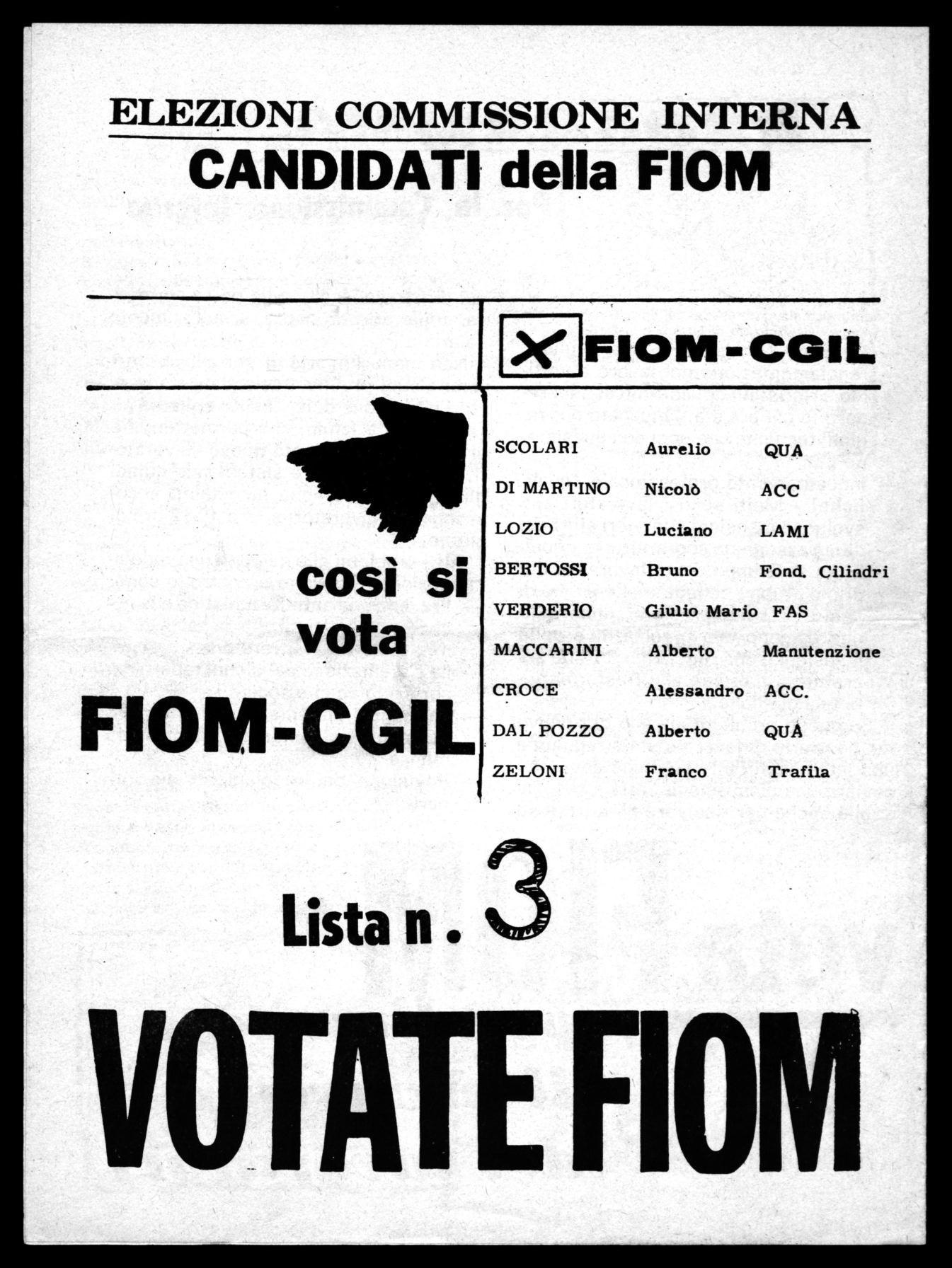 tempo diversi problemi che sono sul tappeto, quali: la regolamentazione dell'orario di lavoro, qualifiche, gli aspetti disciplinari, i riposi di conguaglio ecc. Per impedire che ciò continui è necessaria una più forte Commissione Interna, che in stretta collaborazione con i lavoratori e con i Sindacati imponga il rispetto degli accordi interconfederali, primo tra tutti quello di potersi riunire, prendere contatto con i lavoratori e fare riunioni, intervenire nei vari reparti ove sorgano dei problemi e delle controversie in modo da trovarne le giuste soluzioni. Per imporre ciò è necessario quindi un maggiore affiatamento tra i lavoratori e la C.I. La FIOM, assieme ai suoi candidati, nell'invitarvi a votare tutti si impegna con il vostro aiuto a portare avanti questa battaglia per la soluzione dei vari problemi aperti nella fabbrica e per il rispetto dei vostri diritti