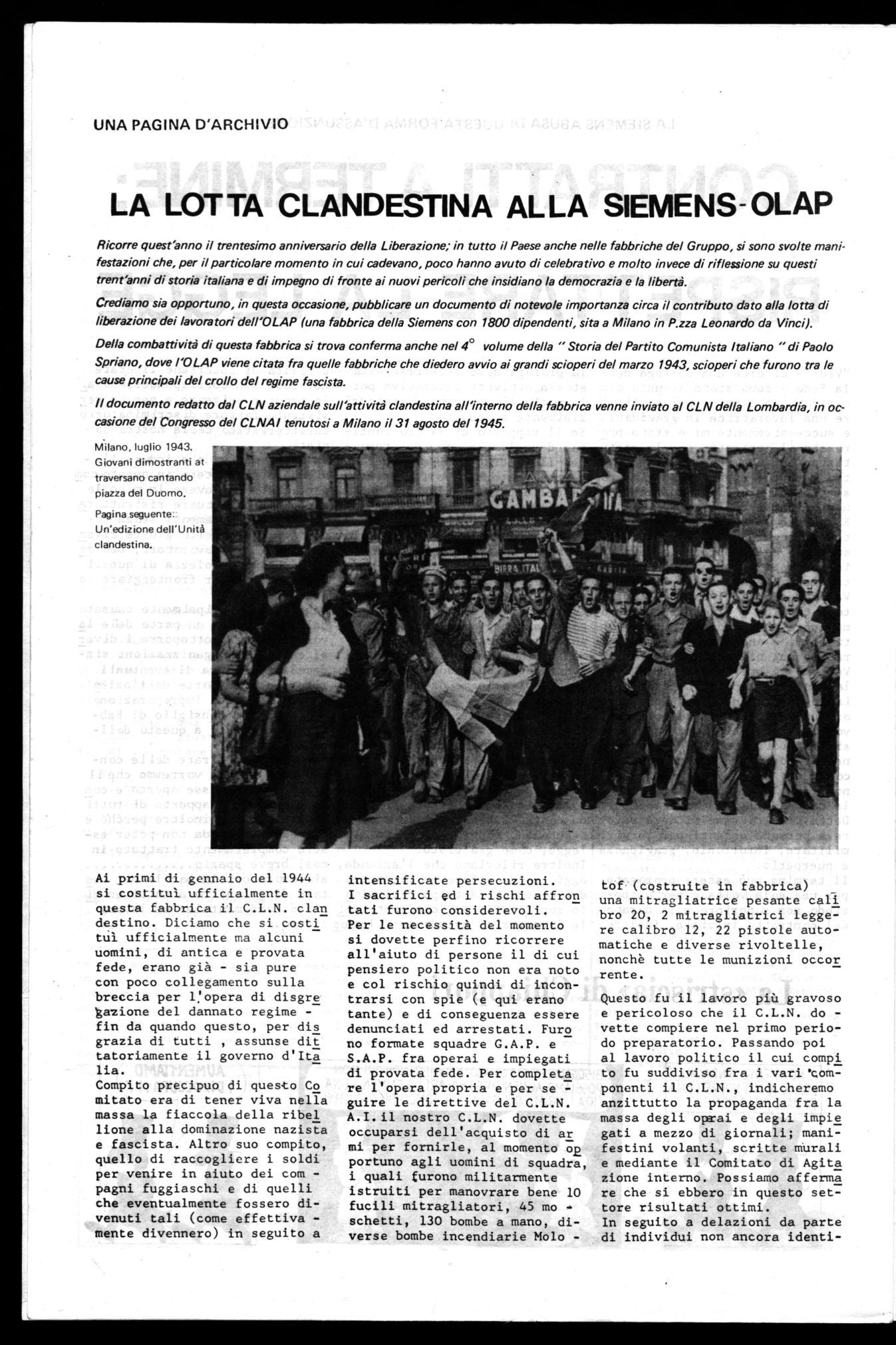 Ricorre quest'anno il trentesimo anniversario della Liberazione; in tutto il Paese anche nelle fabbriche del Gruppo, si sono svolte manifestazioni che, per il particolare momento in cui cadevano, poco hanno avuto di celebrativo e molto invece di riflessione su questi trent'anni di storia italiana e di impegno di fronte ai nuovi pericoli che insidiano la democrazia e la libertà. Crediamo sia opportuno, in questa occasione, pubblicare un documento di notevole importanza circa il contributo dato alla lotta di liberazione dei lavoratori dell'OLAP (una fabbrica della Siemens con 1800 dipendenti, sita a Milano in P.zza Leonardo da Vinci).