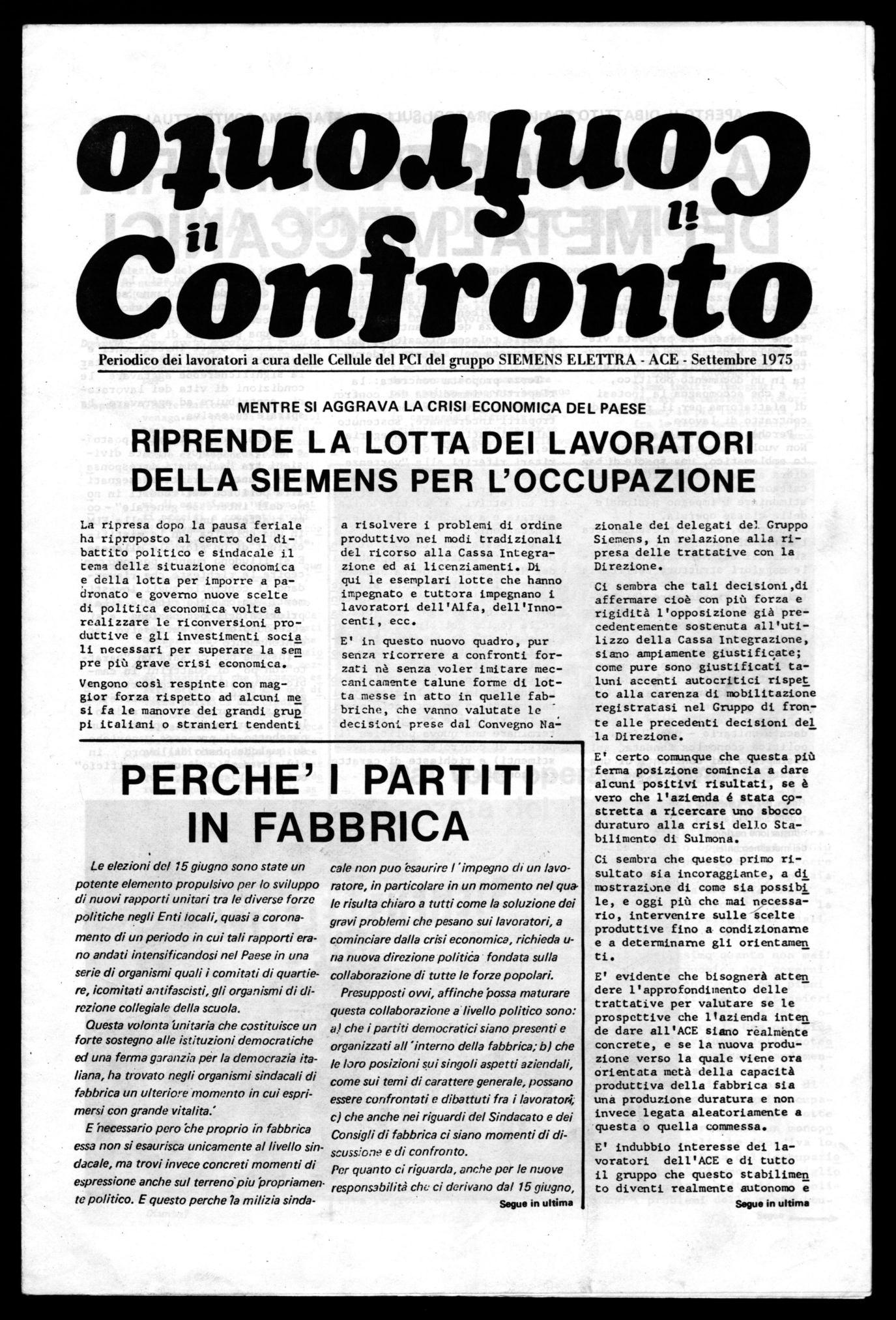 Periodico dei lavoratori a cura delle Cellule del PCI del gruppo SIEMENS ELETTRA - ACE - Settembre 1975