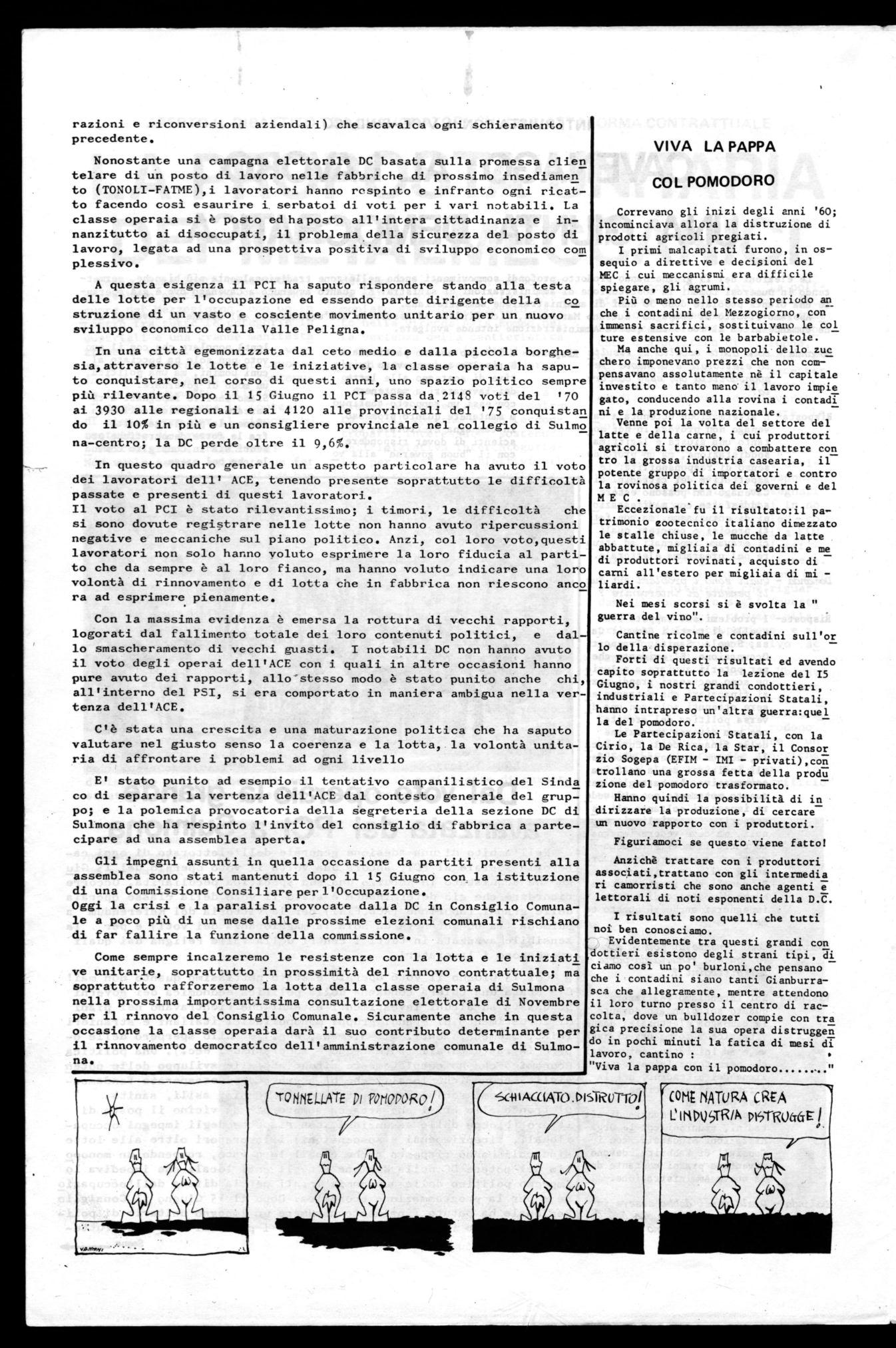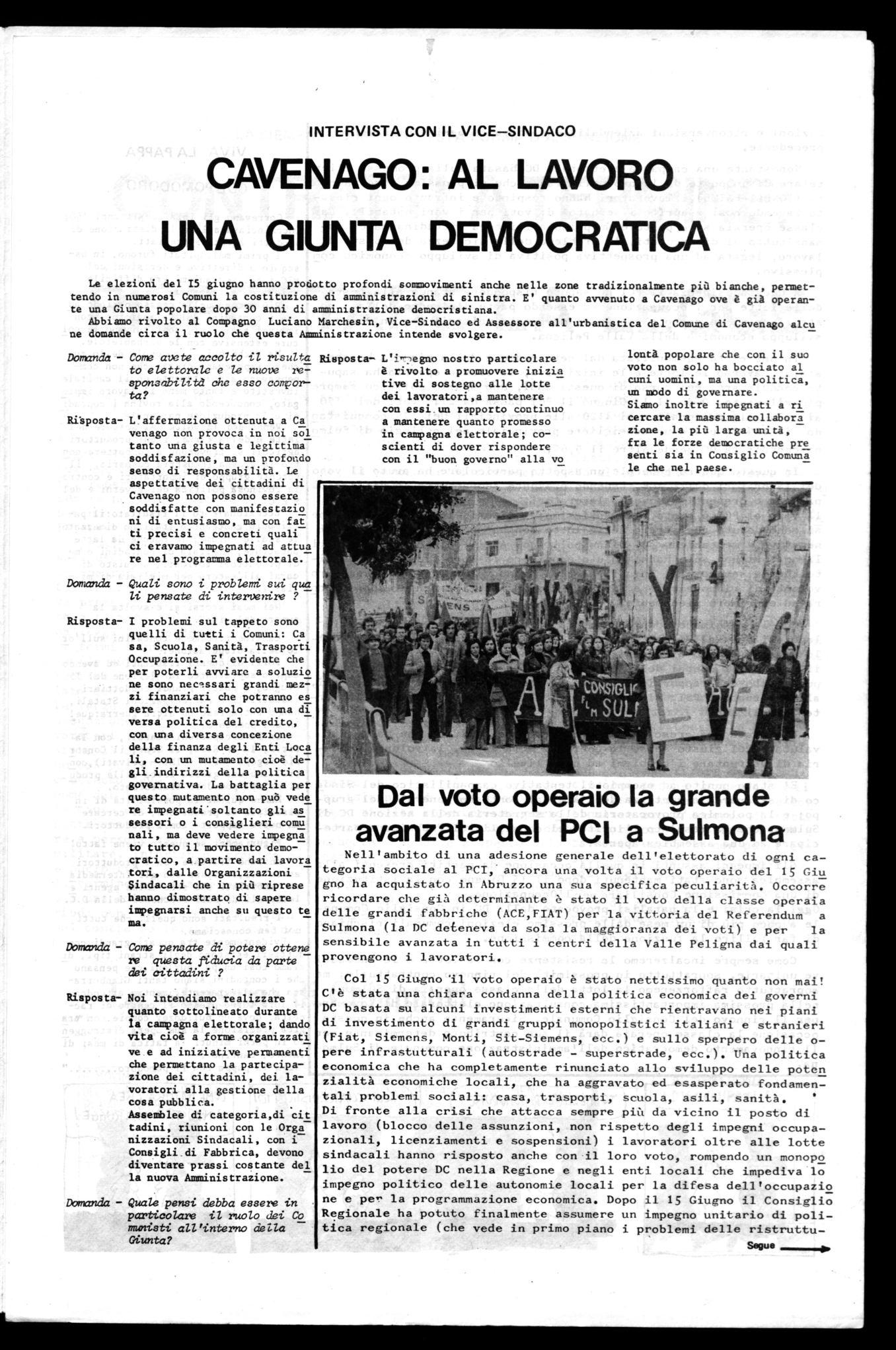 In una città egemonizzata dal ceto medio e dalla piccola borghesia, attraverso le lotte e le iniziative, la classe operaia ha saputo conquistare, nel corso di questi anni, uno spazio politico sempre più rilevante. Dopo il 15 Giugno il PCI passa da 2148 voti del '70 ai 3930 alle regionali e ai 4120 alle provinciali del '75 conquistar do il 10% in più e un consigliere provinciale nel collegio di Sulmo na-centro; la DC perde oltre il 9,6%.
