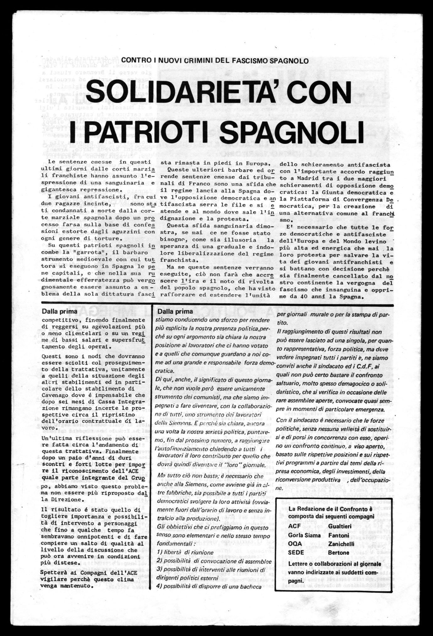 E' necessario che tutte le for ze democratiche e antifasciste dell'Europa e del Mondo levino più alta ed energica che mai la loro protesta per salvare la vita dei giovani antifranchisti e si battano con decisione perchè sia finalmente cancellato dal no stro continente la vergogna del fascismo che insanguina e opprime da 40 anni la Spagna.