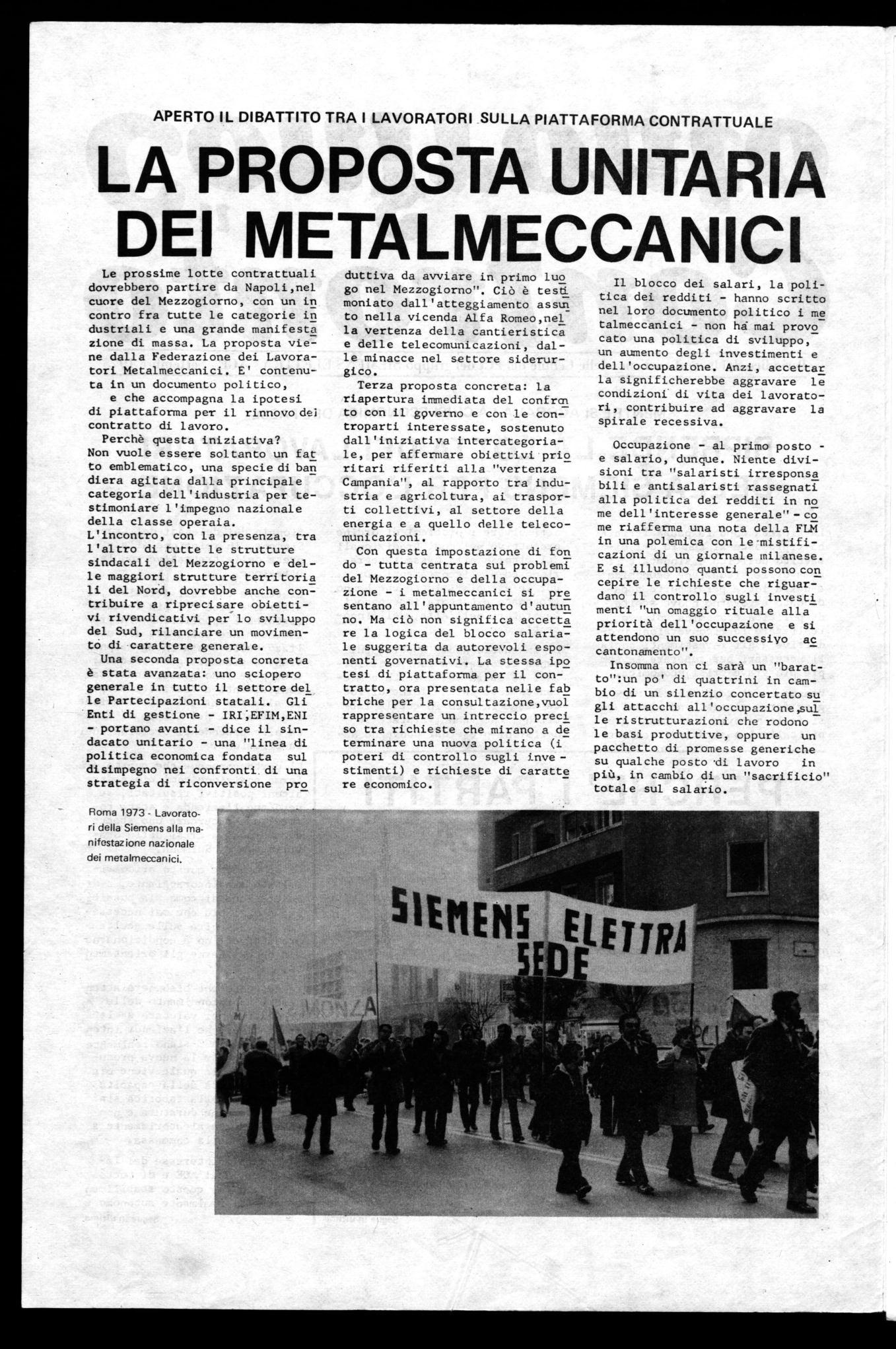 Con questa impostazione di fon do - tutta centrata sui problemi del Mezzogiorno e della occupazione - i metalmeccanici si pre sentano all'appuntamento d'autun no. Ma ciò non significa accetta re la logica del blocco salariale suggerita da autorevoli esponenti governativi. La stessa ipo tesi di piattaforma per il contratto, ora presentata nelle fab briche per la consultazione,vuol rappresentare un intreccio preci so tra richieste che mirano a de terminare una nuova politica (i poteri di controllo sugli investimenti) e richieste di caratte re economico.