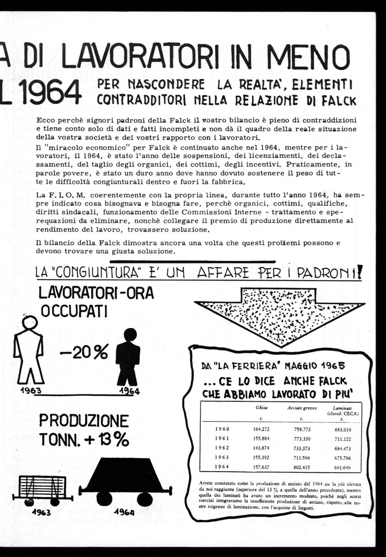Il "miracolo economico" per Falck è continuato anche nel 1964, mentre per i lavoratori, il 1964, è stato l'anno delle sospensioni, dei licenziamenti, dei declassamenti, del taglio degli organici, dei cottimi, degli incentivi. Praticamente, in parole povere, è stato un duro anno dove hanno dovuto sostenere il peso di tutte le difficoltà congiunturali dentro e fuori la fabbrica.
