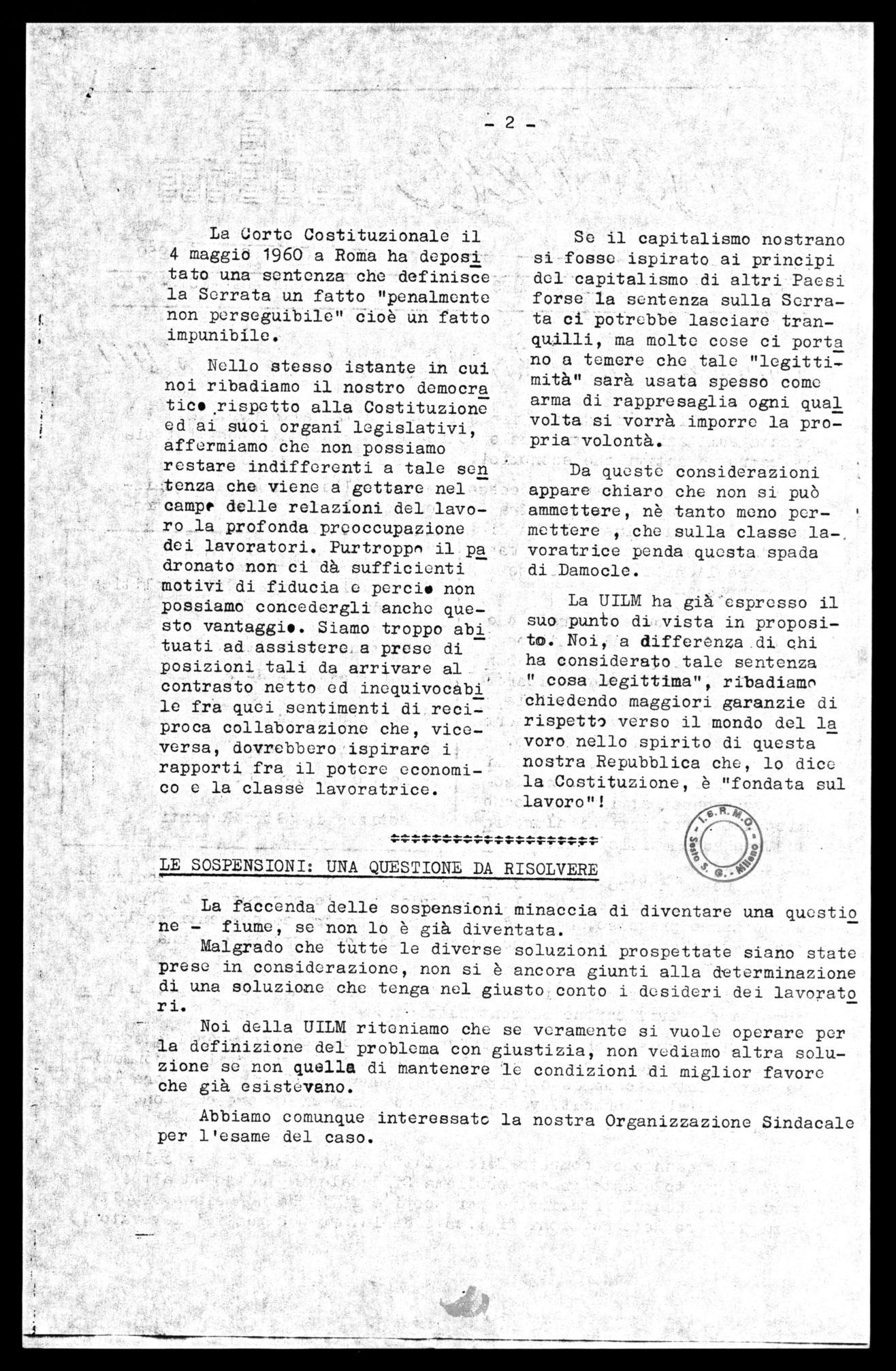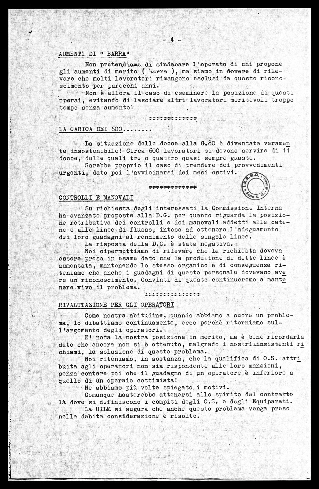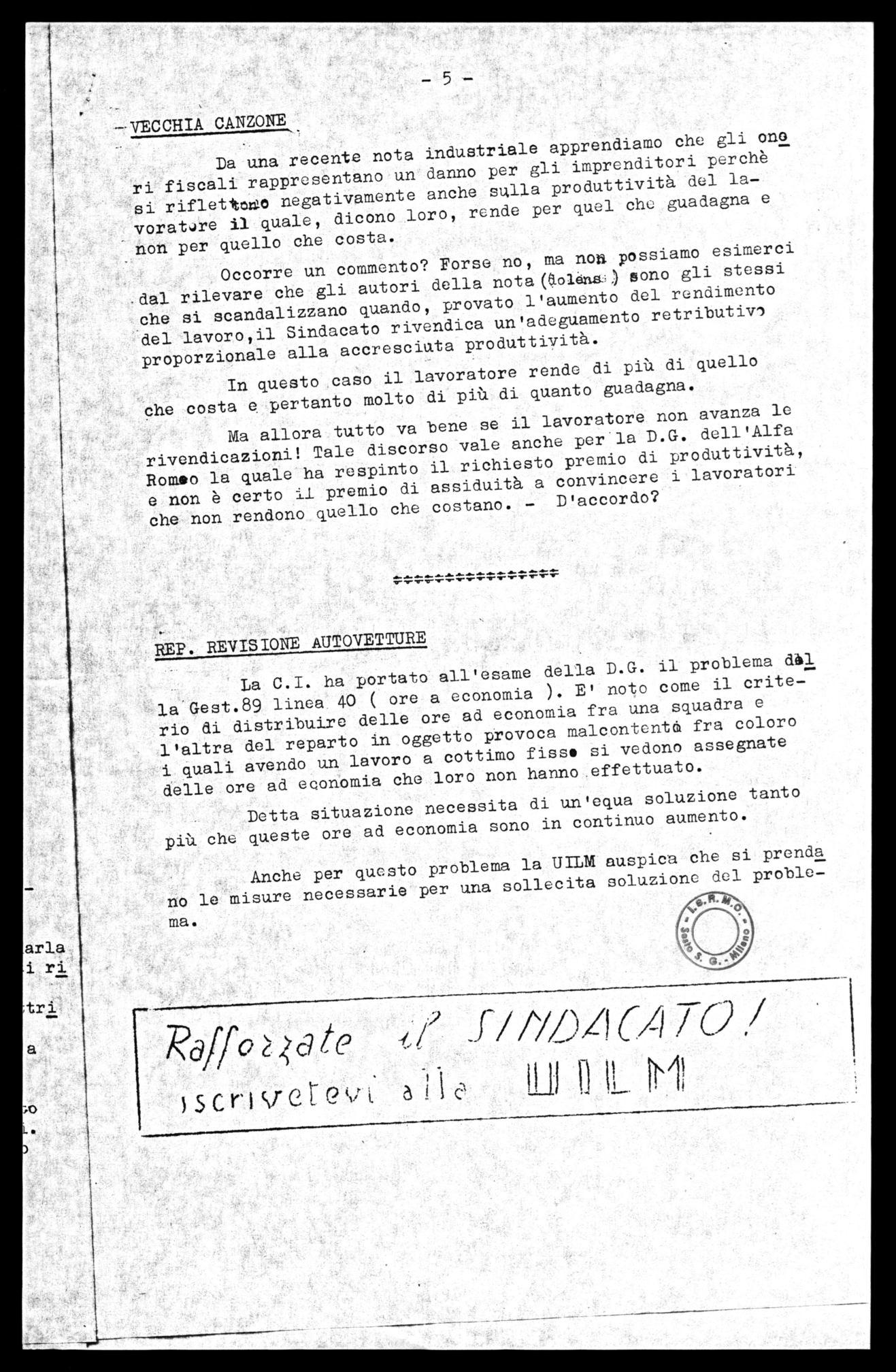 Ci auguriamo che per il futuro si possa portare avanti questa azione per conquistare sostanziali miglioramenti salariali e normativi per l'intero complesso (Alfa Romeo) tenendo nel giusto valore le reali condizioni produttive ed il nuovo ritmo di lavoro cui sono so& getti i lavoratori.-