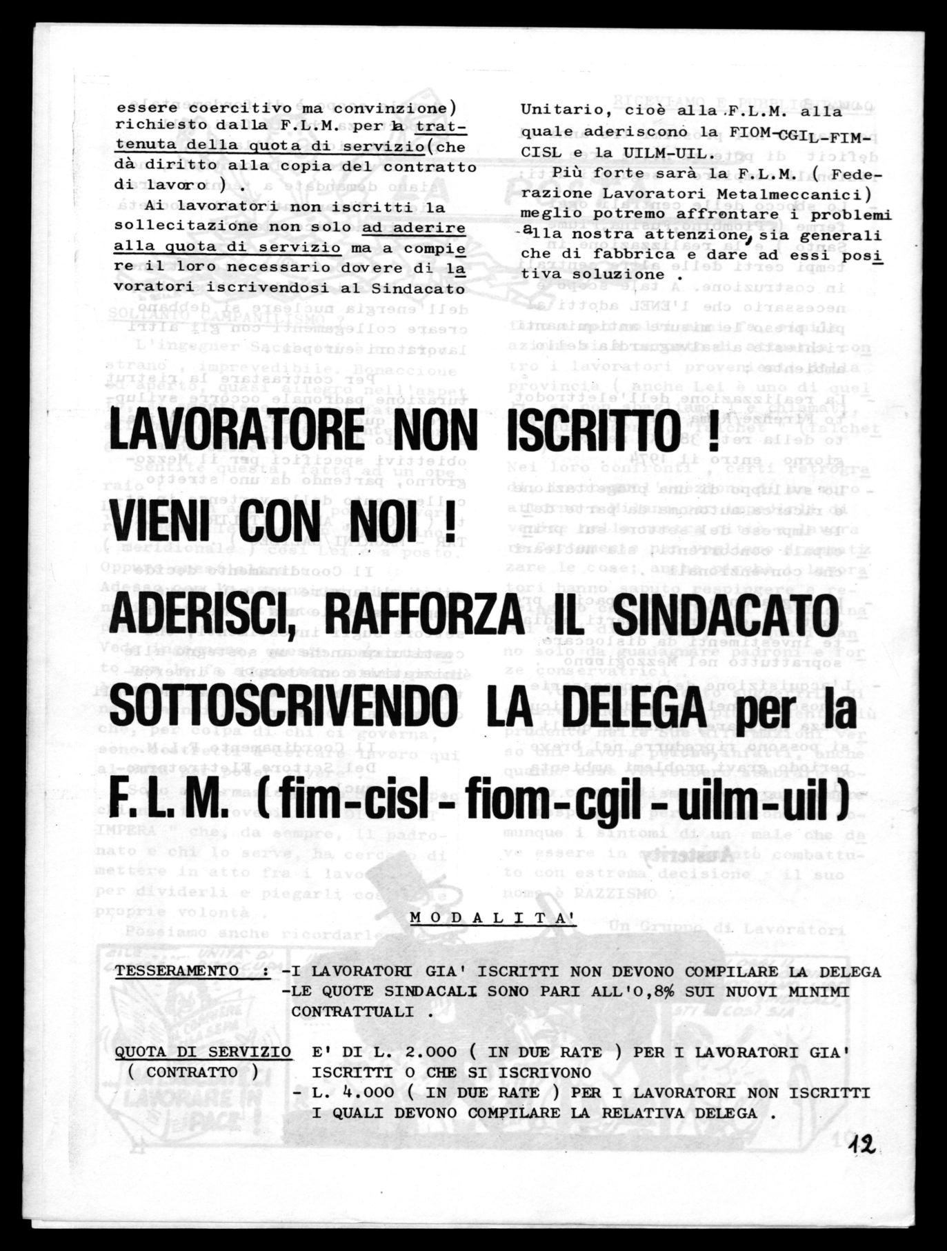 Più forte sarà la F.L.M. ( Federazione Lavoratori Metalmeccanici) meglio potremo affrontare i problemi - alla nostra attenzionei sia generali che di fabbrica e dare ad essi posi tiva soluzione .