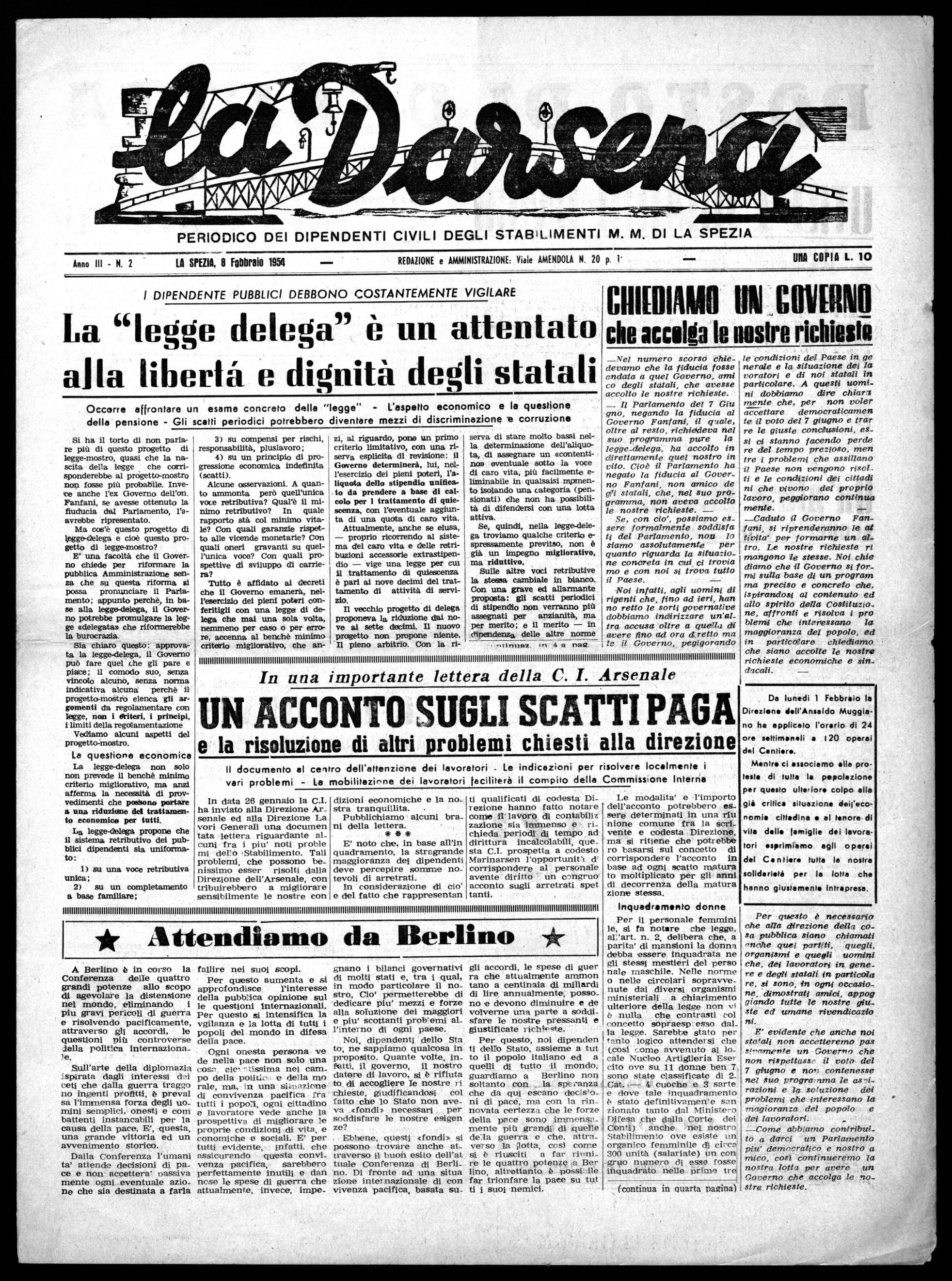 PERIODICO DEI DIPENDENTI CIVILI DEGLI STABILIMENTI M. M. DI LA SPEZIA AMI/M.~1MM~ MilIMMI1151. Anno III - N. 2 LA SPEZIA, 8 Febbraio 1954 REDAZIONE e AMMINISTRAZIONE: Viale AMENDOLA N. 20 p. 1' UNA COPIA L. 10