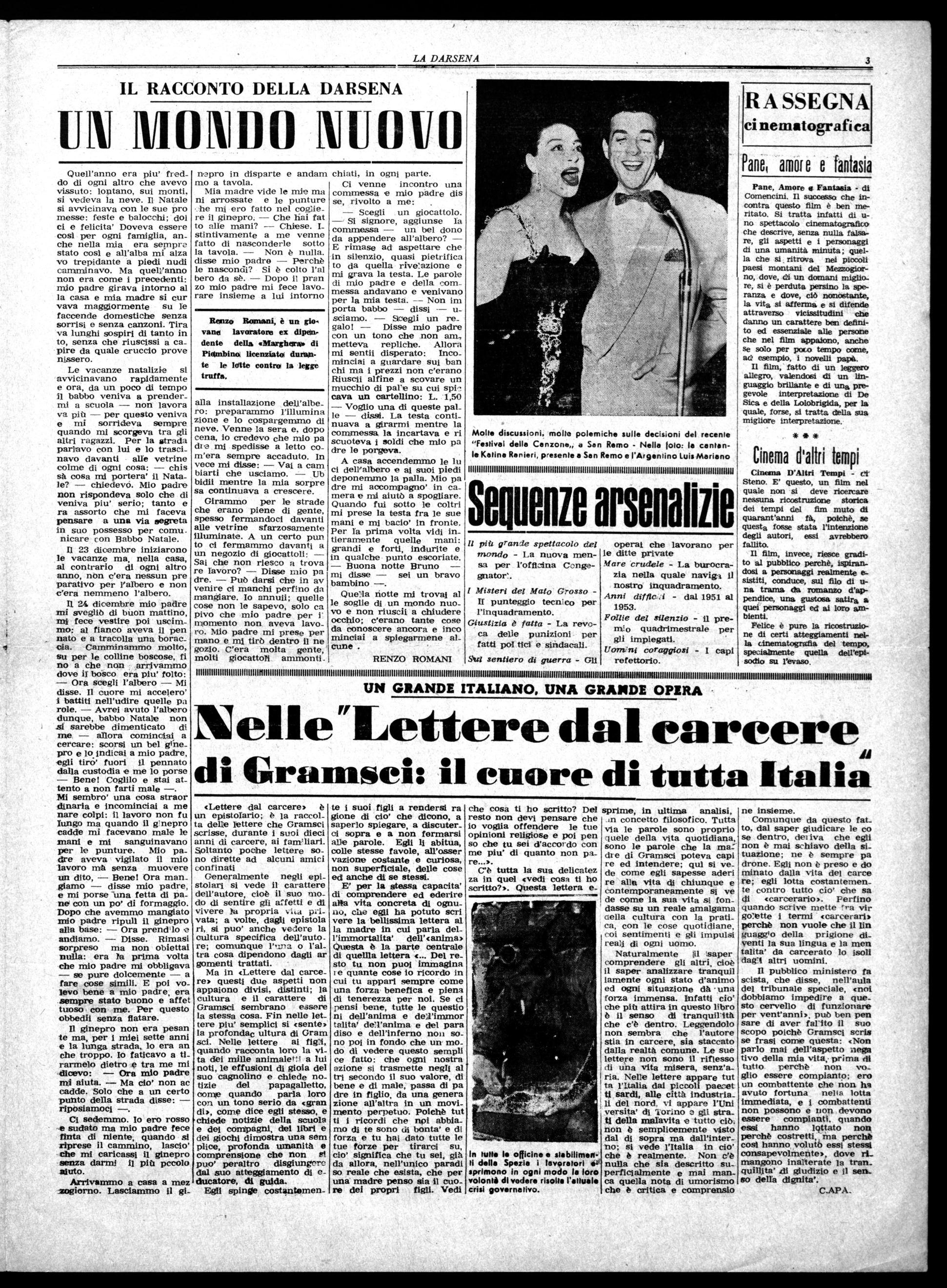 Naturalmente Saper comprendere gli altri, cioè il saper analizzare tranquil lamente ogni stato d'animo ed ogni situazione dà • una forza immensa. Infatti cio' che più attira in questo libro è il senso di tranquillità che c'è dentro. Leggendolo non sembra che l'autore stia in carcere, sia staccato dalla realtà comune. Le sue lettere non sono il riflesso h una vita misera, senz'aria. Nelle lettere appare tut ta l'Italia dai piccoli paeeet ti sardi, alle città industria_ 11 del nord, vi appare l'Uni versita' di "tonno 3 gli strati della ~l evita e tutto ciò. non è semplicemente visto dal di sopra ma dall'interno; si vede l'Italia in cio' che è realmente. Non c'è nulla che sia descritto superficialmente e mai manca quella nota di umorismo che è critica e comprensio
