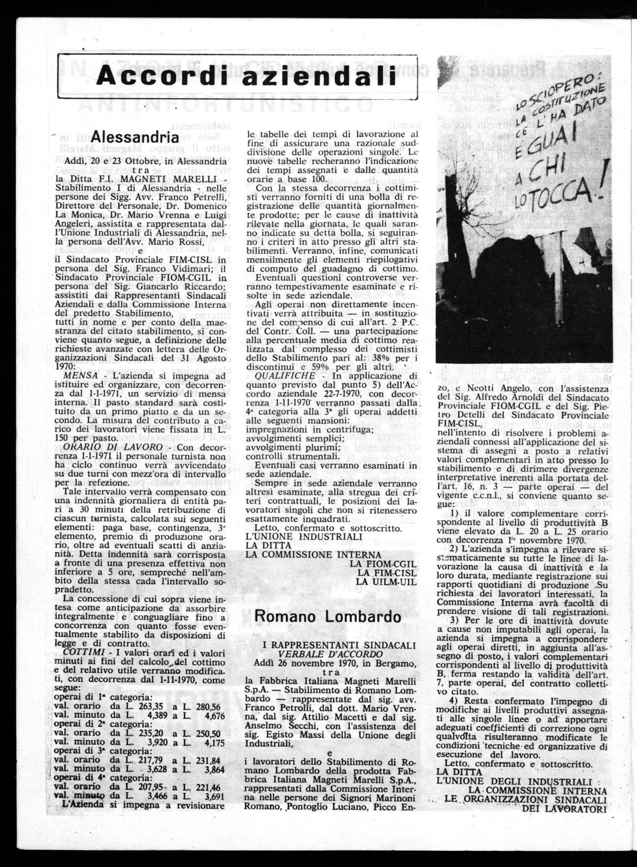 Addì, 20 e 23 Ottobre, in Alessandria tra la Ditta F.I. MAGNETI MARELLIStabilimento I di Alessandria - nelle persone dei Sigg. Avv. Franco Petrelli, Direttore del Personale, Dr. Domenico La Monica, Dr. Màrio Vrenna e Luigi Angeleri, assistita e rappresentata dall'Unione Industriali di Alessandria, nella persona dell'Avv. Mario Rossi, e il Sindacato Provinciale FIM-CISL in persona del Sig. Franco Vidimari; il Sindacato Provinciale FIOM-CGIL in persona del Sig. Giancarlo Riccardo; assistiti dai Rappresentanti Sindacali Aziendali e dalla Commissione Interna del predetto Stabilimento, tutti in nome e per conto della maestranza del citato stabilimento, si conviene quanto segue, a definizione delle richieste avanzate con lettera delle Organizzazioni Sindacali del 31 Agosto 1970: