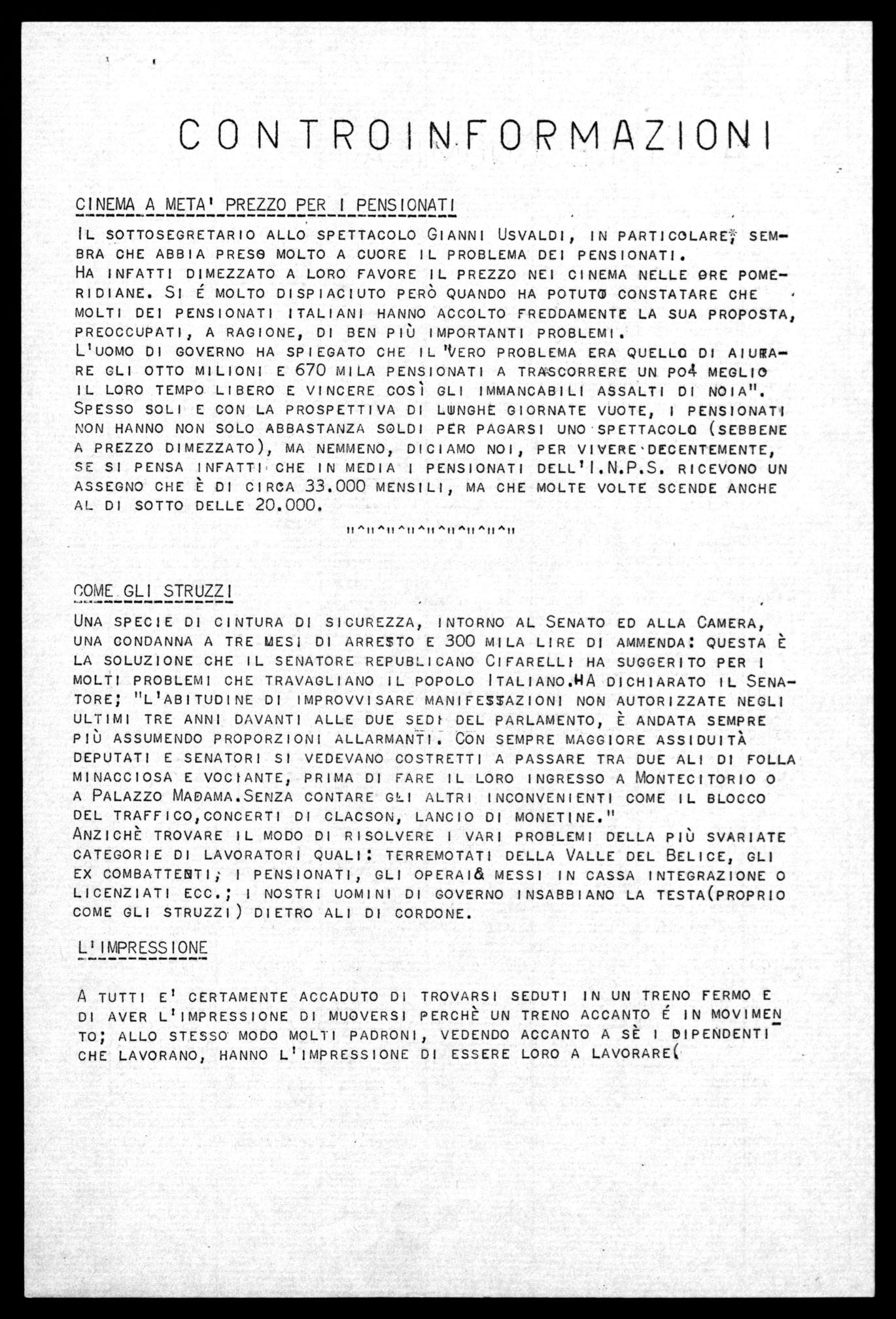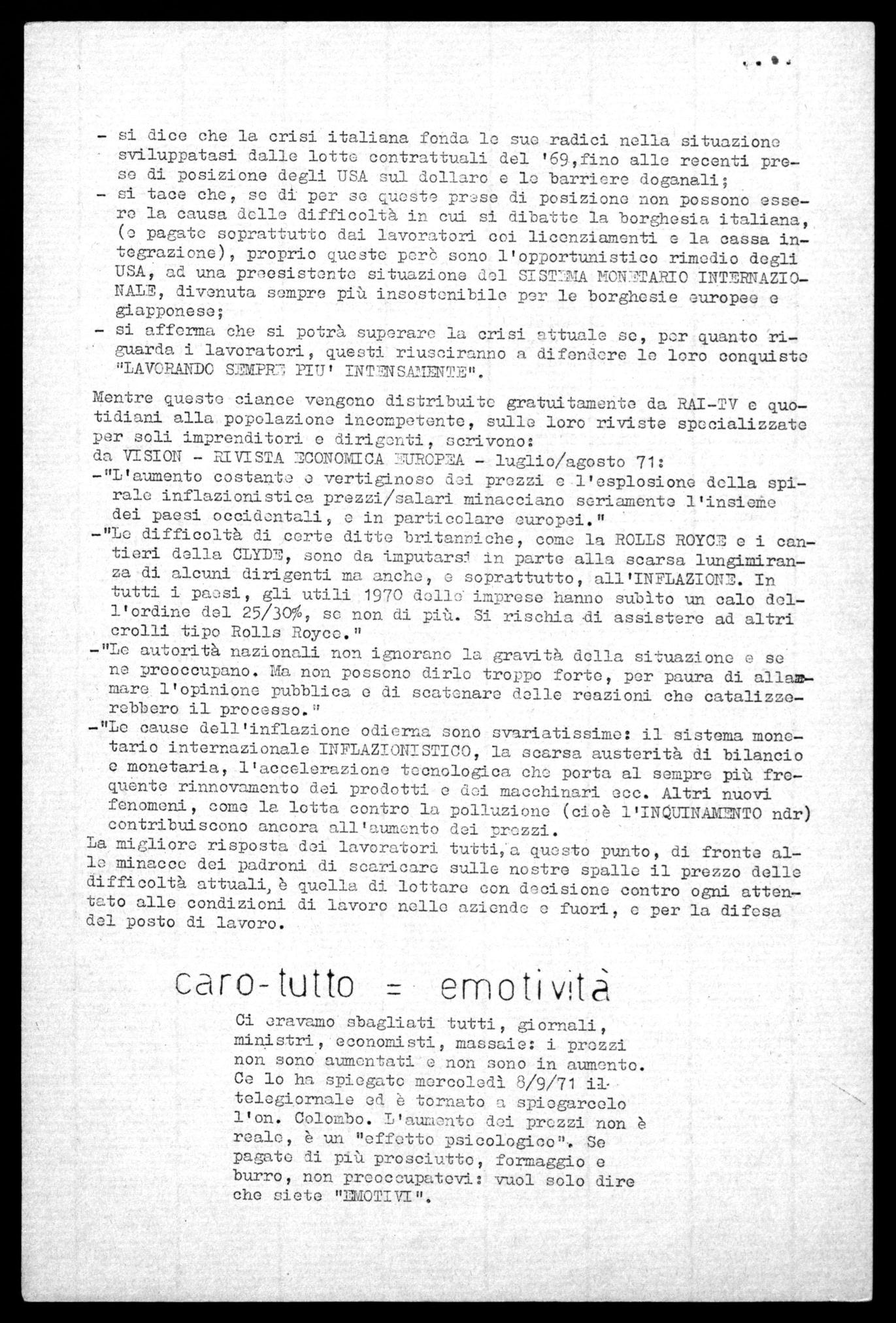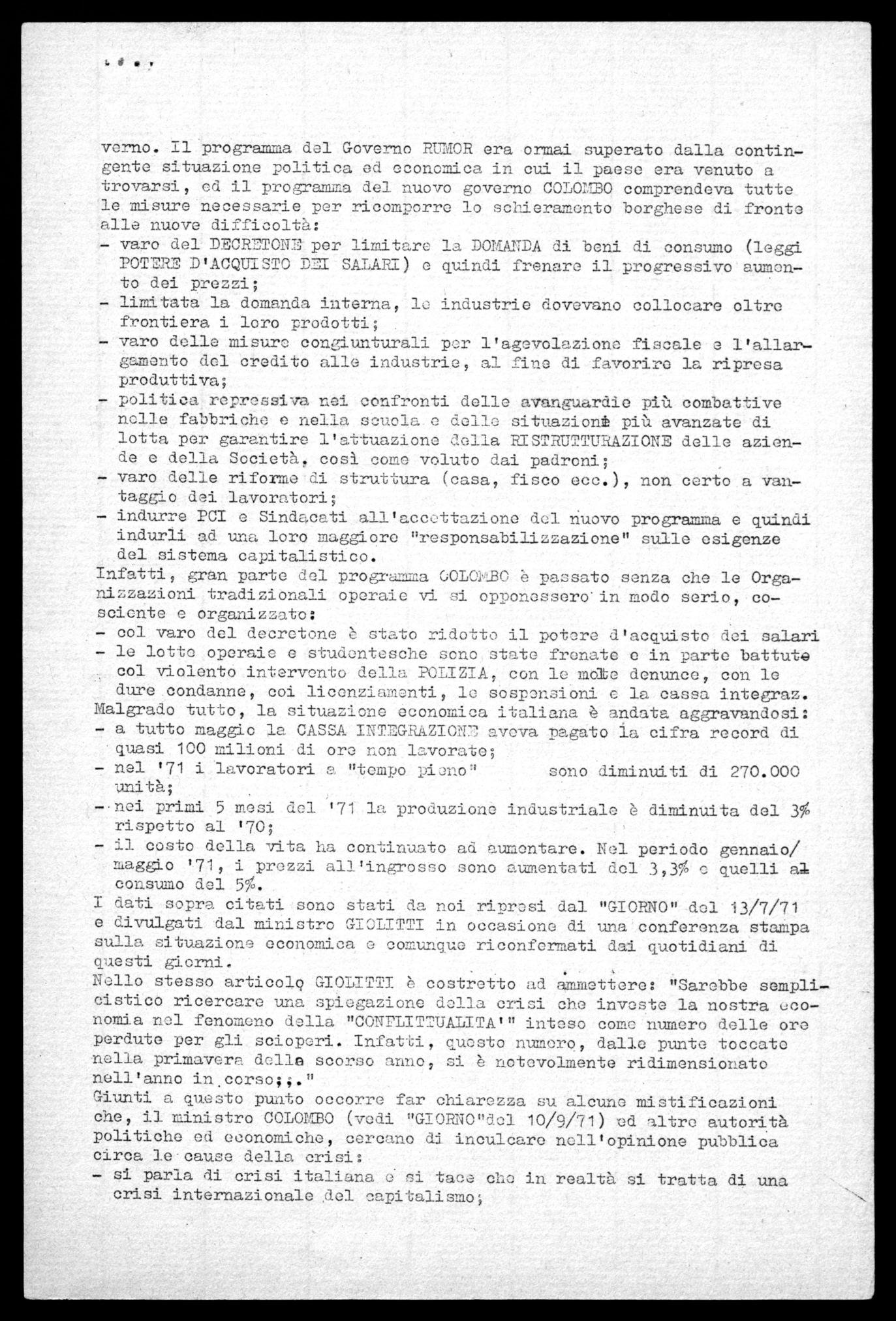 Infatti, gran parte dal progn-ìmma GOTA:1.30 é passato senza che le Organizzazioni tradizionali operaie vi si opponessero' in modo serio, cosciente e organizzato: col varo del decretone è stato ridotto il potere d'acquisto dei salari le lotte operaie e studentesche sono state frenate e in parto battuta col violento intervento della POLIZIA, con le mo'e denunce, con le dure condanne, coi licenziamenti, lo sospensioni o la cassa integraz.