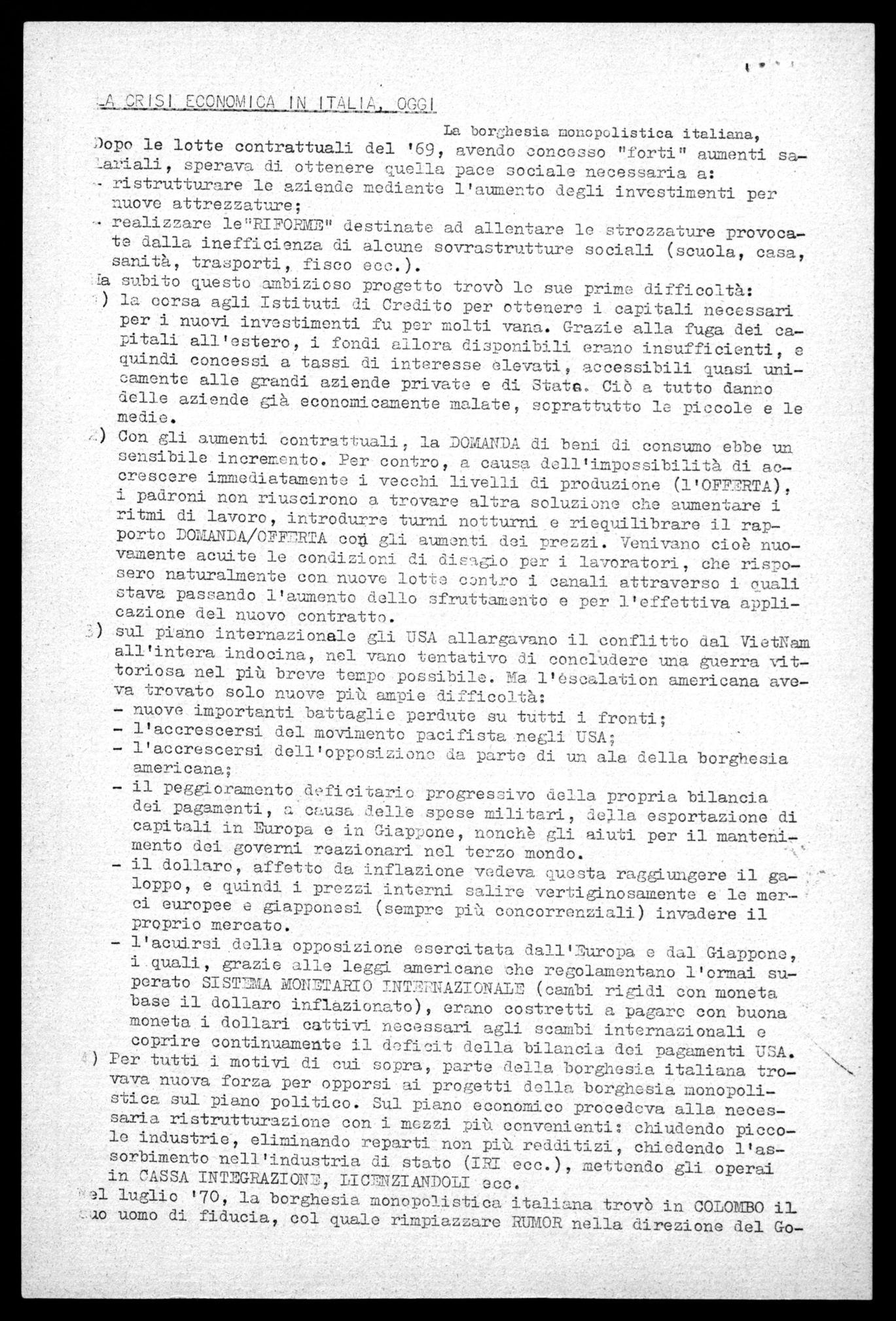 si dice che la crisi italiana fonda lo sue radici nella situazione sviluppatasi dalle lotte contrattuali del '69,fino alle recenti prese di posizione degli USA sul dollaro e lo barriere doganali; si tace che, se di per se queste prese di posizione non possono essere la causa delle difficoltà in cui si dibatte la borghesia italiana, (o pagato soprattutto dai lavoratori coi licenziamenti e la cassa integrazione), proprio questo però sono l'opportunistico rimedio degli USA, ad una proesistonte situazione dol SIST:MA MON?TARIO INTERNAZIONALE, divenuta sempre più insostenibile per le borghesie europeo e giapponese;