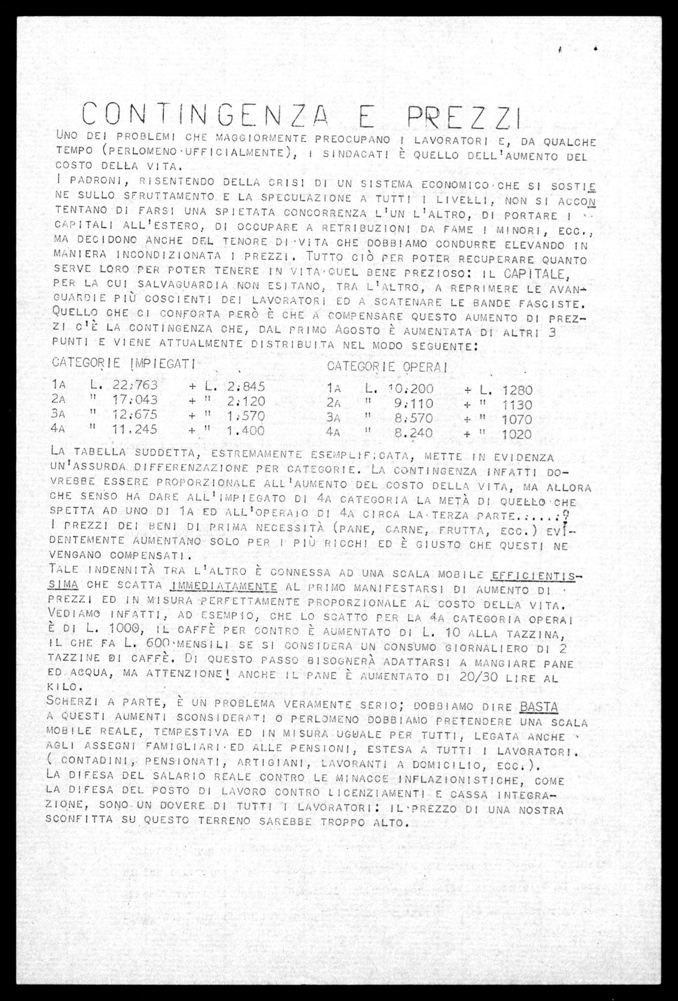 I PADRONI, RISENTENDO DELLA CRISI DI UN SISTEMA ECONOMICO-CHE SI SOSTIE NE SULLO SFRUTTAMENTO E LA SPECULAZIONE A TUTTI I LIVELLI, NON SI ACCON TENTANO 'DI FARSI UNA SPIETATA CONCORRENZA L'UN L'ALTRO, DI PORTARE I s. CT-PITALI ALL'ESTERO, DI OCCUPARE A RETRIBUZIONI DA FAME I MINORI, ECC., MA DECIDONO ANCHE DEL TENORE DI•ViTA CHE DOBBIAMO CONDURRE ELEVANDO IN MANIERA INCONDIZIONATA I PREZZI, TUTTO CIÒ PER POTER RECUPERARE QUANTO SERVE LORO PER POTER TENERE IN V1TA'QUEL BENE PREZIOSO: IL CAPITALE, PER LA CUI SALVAGUARDIA NON ESITANO, TRA L'ALTRO, A REPRIMERE LE AVAN—'. GUARDIE Più COSCIENTI DEI LAVORATORI ED A SCATENARE LE BANDE FASCISTE. QUELLO CHE CI CONFORTA PERÒ L CHE A COMPENSARE QUESTO AUMENTO DI PREZ— ZI Cq: LA CONTINGENZA CHE, DAL PRIMO AGOSTO L AUMENTATA DI ALTRI 3 PUNTI E VIENE ATTUALMENTE DISTRIBUITA NEL MODO SEGUENTE: CATEGORIE
